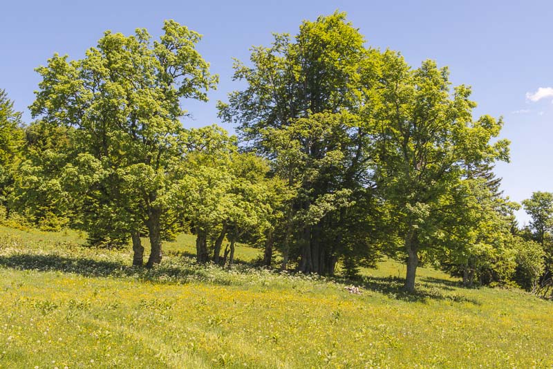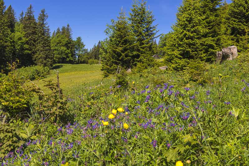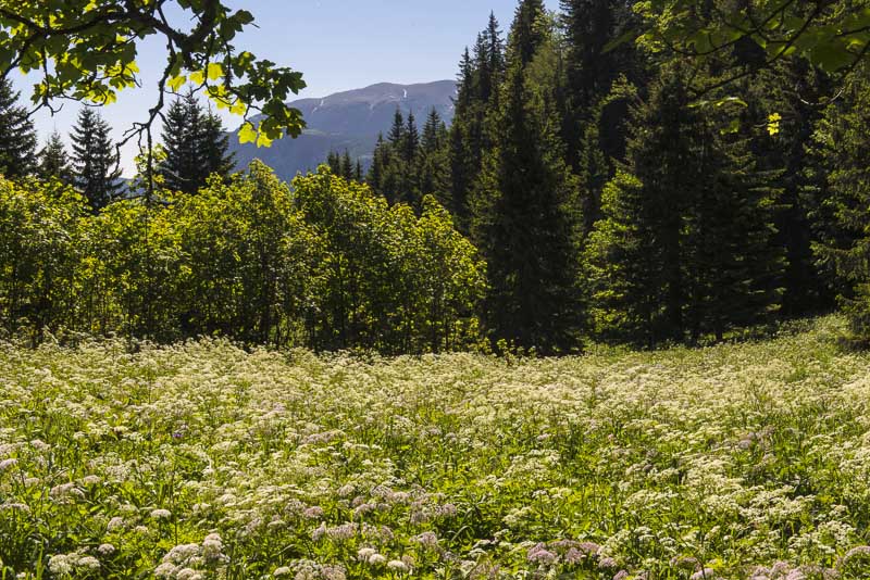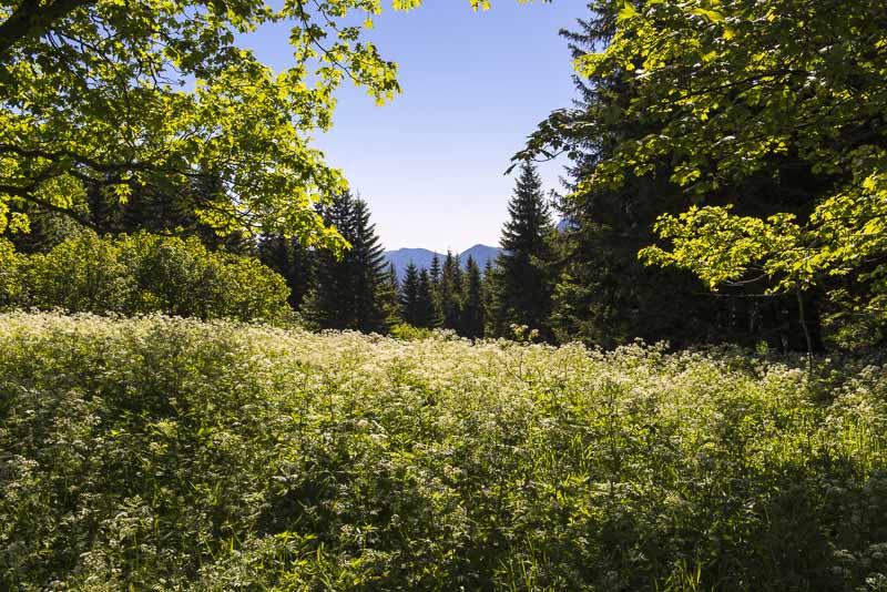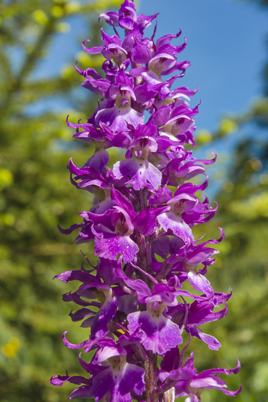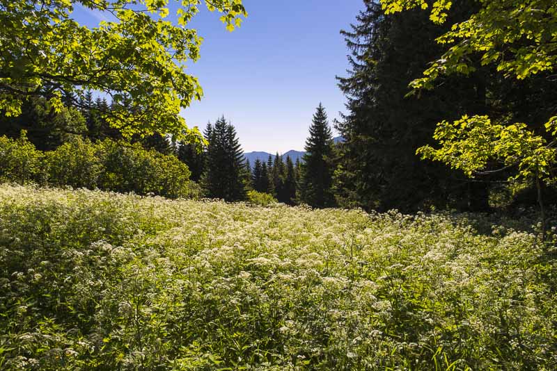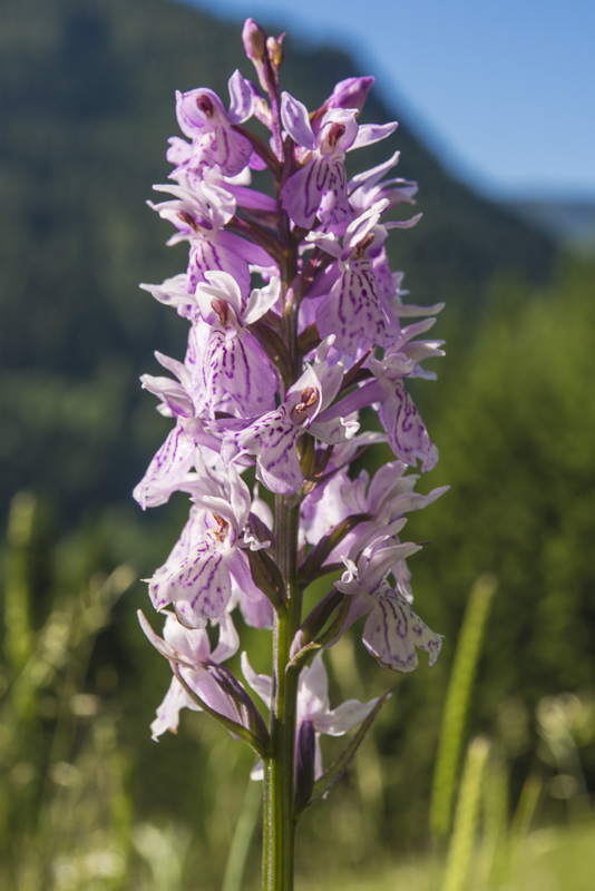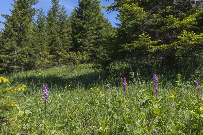 Oberhalb der eigentlichen Almwiese auf den Wiesenflecken im lockeren Wald zahlreiche weitere Exemplare des Stattlichen Knabenkrauts (Orchis mascula subspecies signifera)