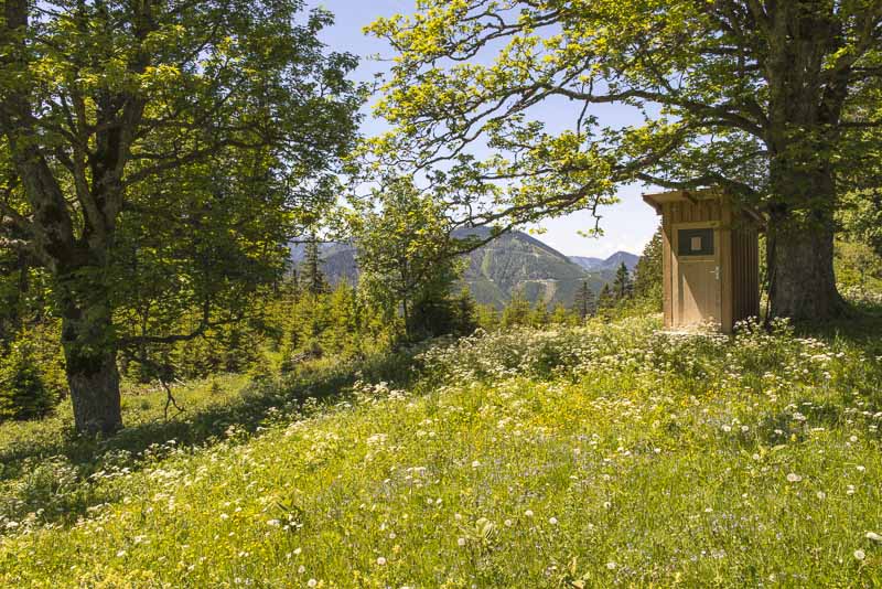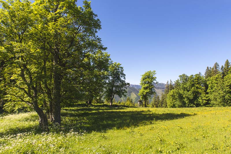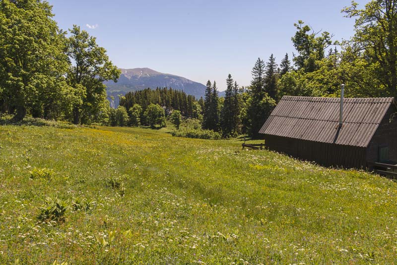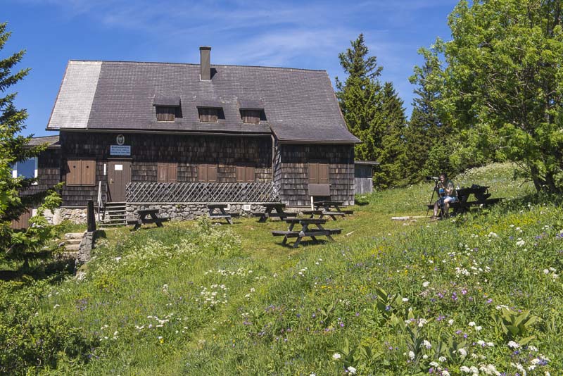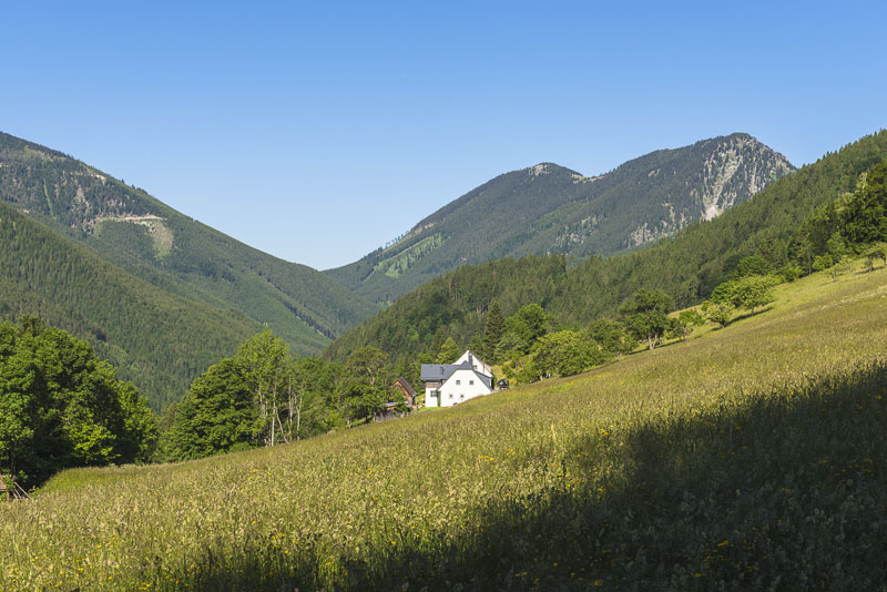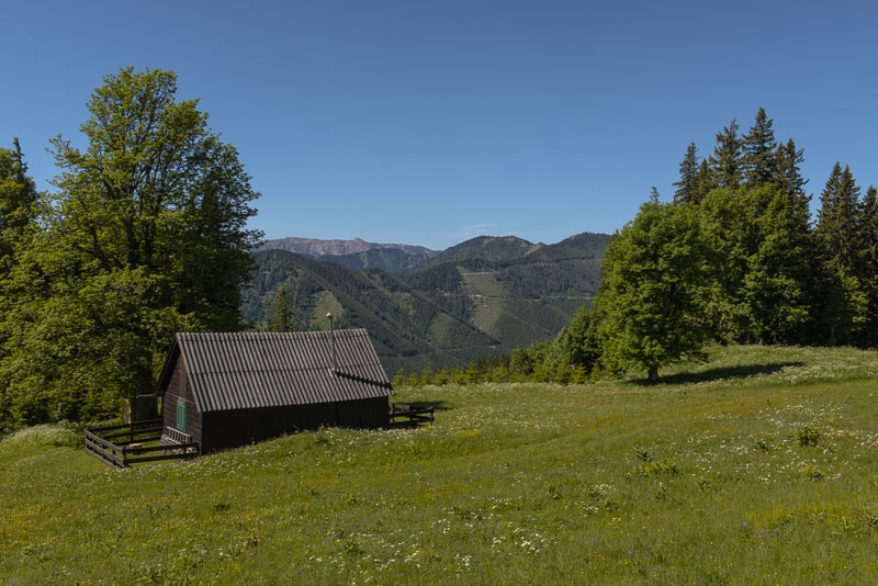 Die Jagdhütte am westlichen Ende der Obersberg Alm. Im Hintergrund die Schneealpe.