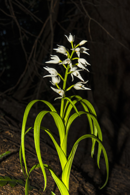 Schwertblättriges Waldvöglein - mitten im finsteren Fichtenwald. Hier hilft nur mehr der Kamerablitz.