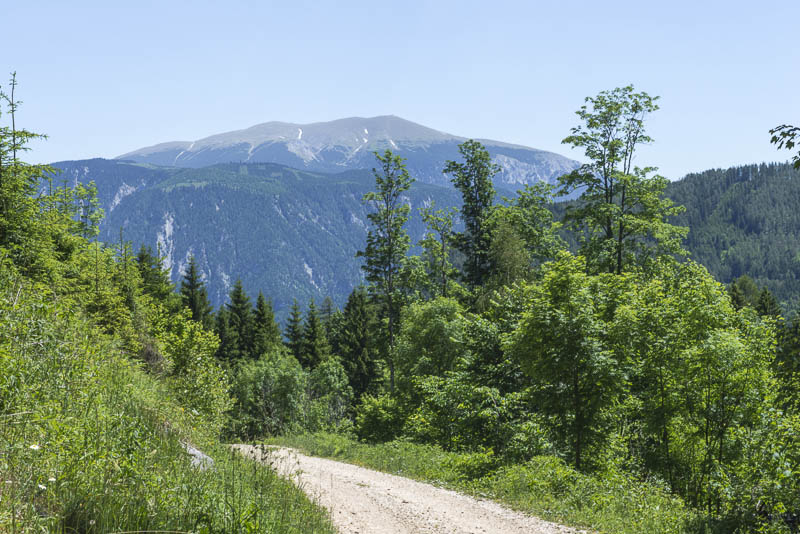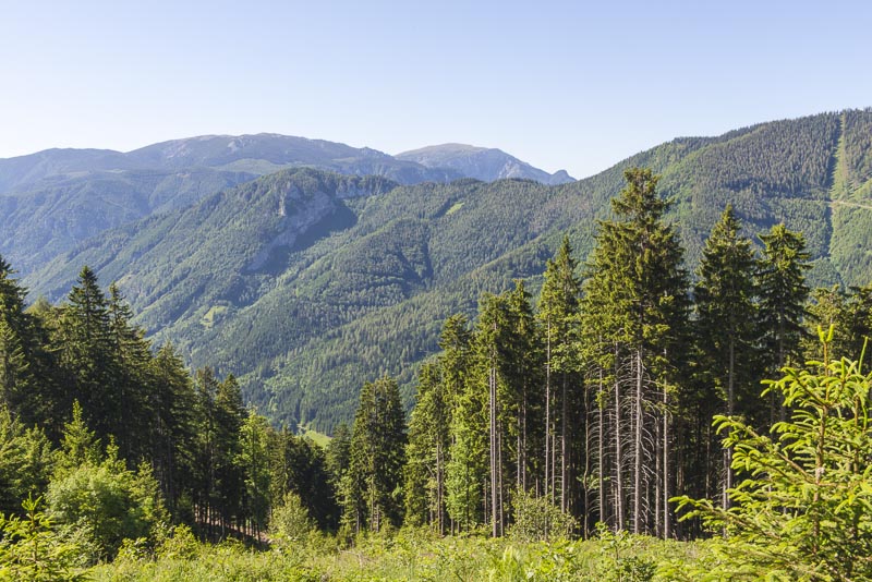 Ein kleiner (Kahl-) Schlag ermöglicht einen Blick zur Rax.