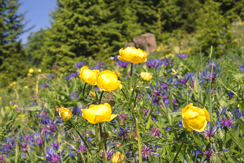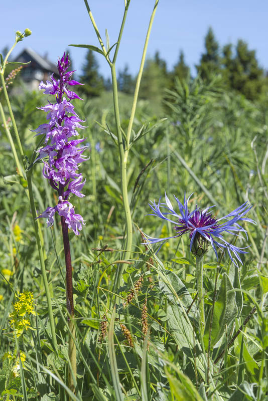 Stattliches Knabenkraut (Orchis mascula subspecies signifera) und Berg - Flockenblume (Centaurea montana)