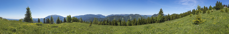 180 Grad Panoramabild der Obersberg - Alm. Ganz links der Schneeberg. Hierher oder ins Bild klicken für eine größere Darstellung.