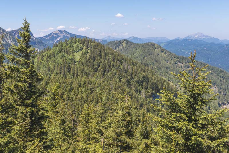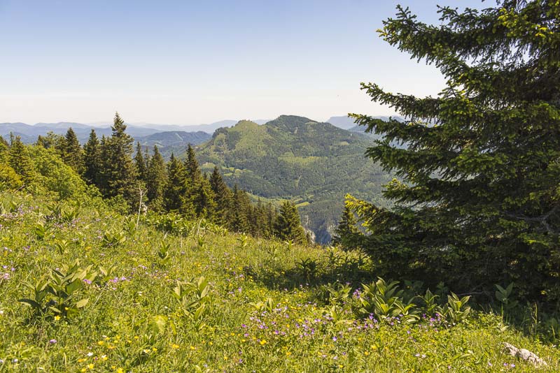 Blick vom Gipfelkreuz nach Westen. Gippel (hinter dem Baumwipfel), Göller, im Hintergrund Dürrenstein, ganz rechts der Ötscher.