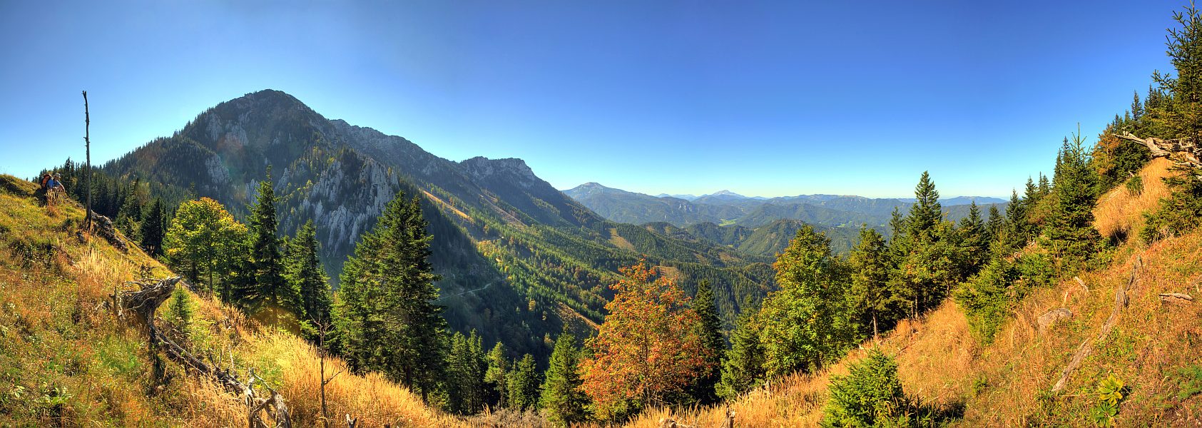 180° panoramic view to the West from near Preinecksattel. In the foreground Gippelmauer with Schwarzauer Gippel and Gippel, then Goeller and Oetscher in the distance.