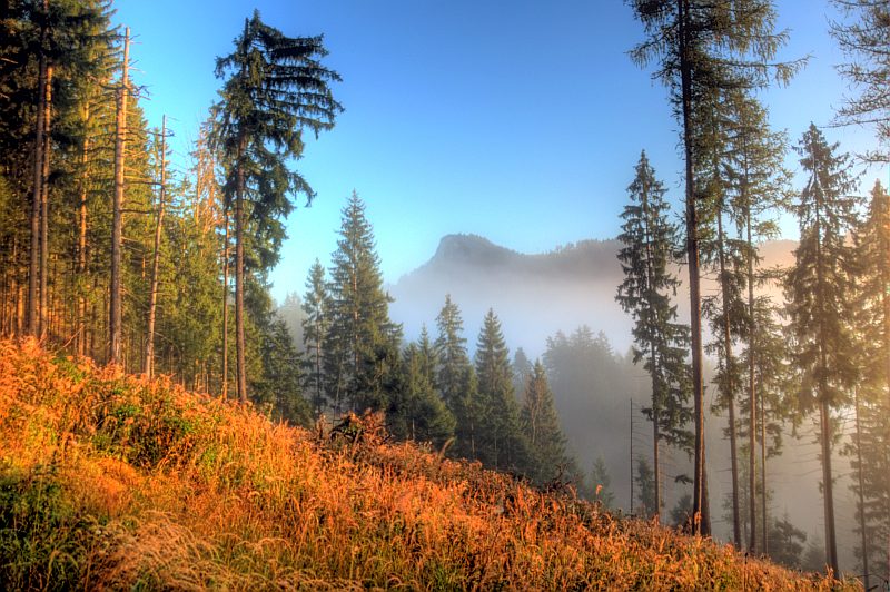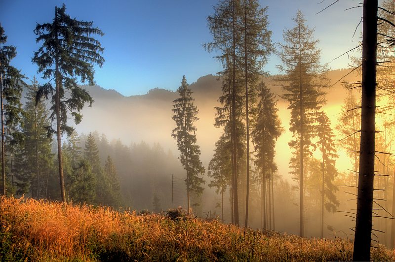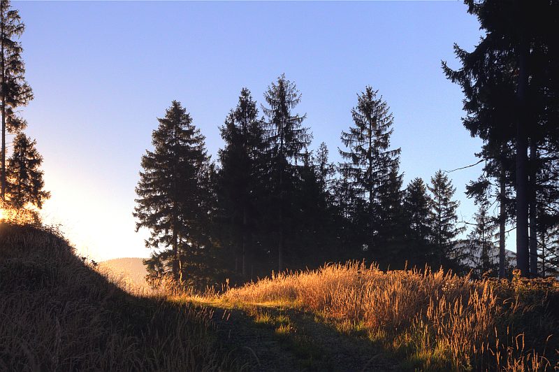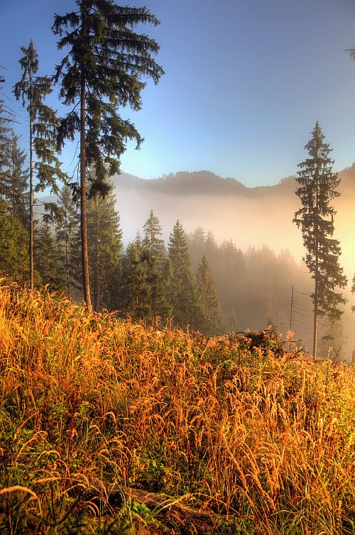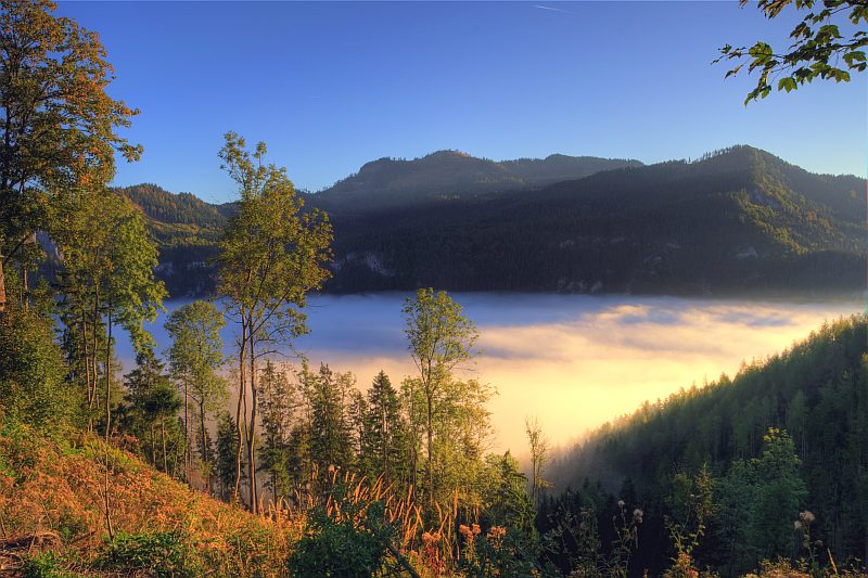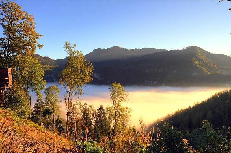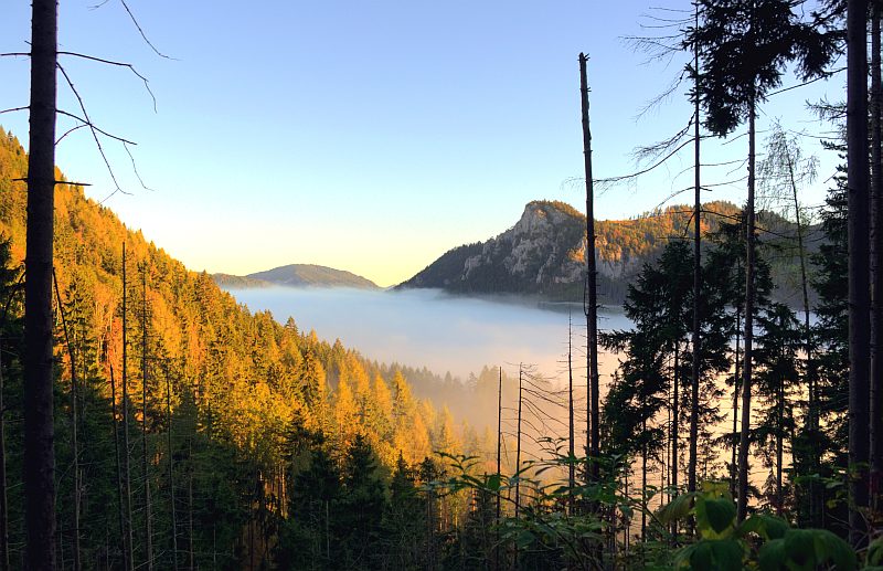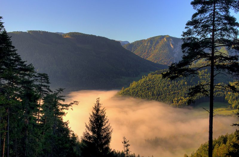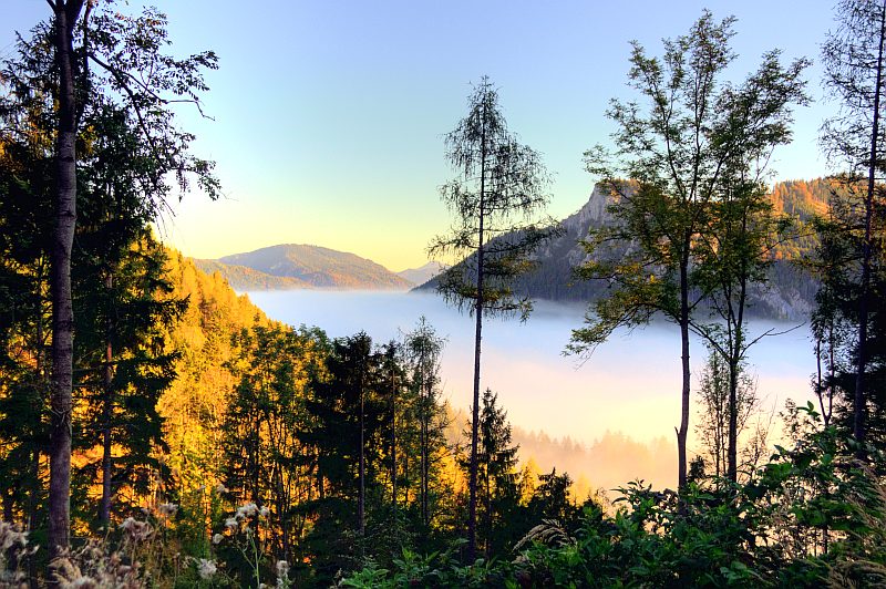 We meet at 6 a.m. near the village of Piesting, then drive through the Piesting valley and over Klostertal saddle to Schwarzau im Gebirge. First however, we further drive into the Prein dale and drop my mountain bike at a location called Triebl (I shall use the bike to ride the 10 km distance back to Schwarzau to get the car). At that time, dense fog is laying over the Hoellental; soon, however, we get a first glimpse of the sun.