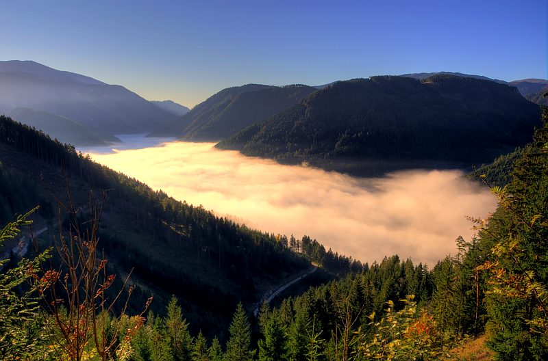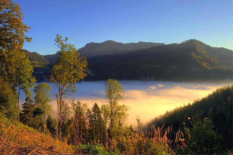 A good bit higher now, we are walking away from Hoellental in a western direction, along its side valley, the Preintal. Still mist in the dale ...