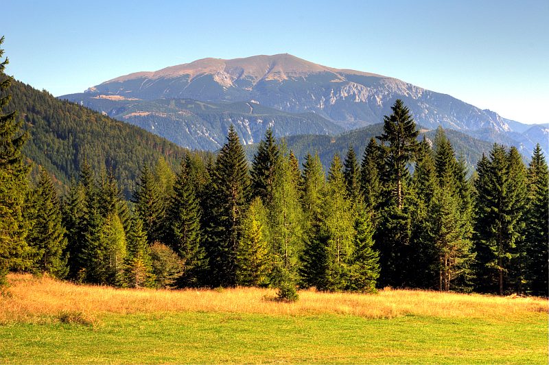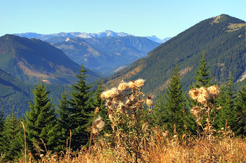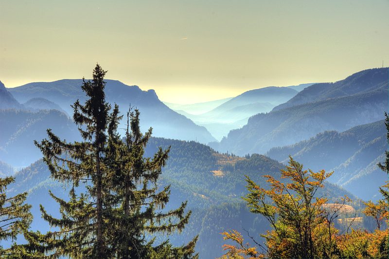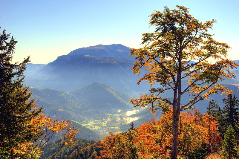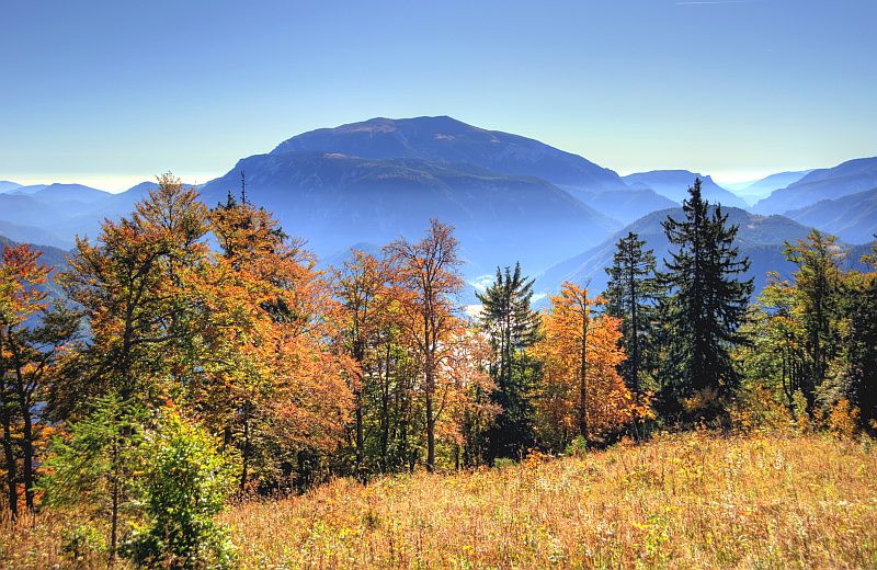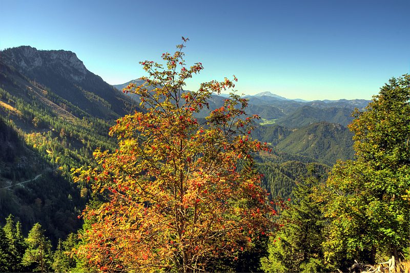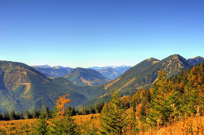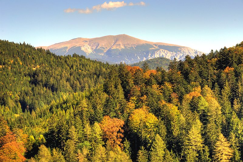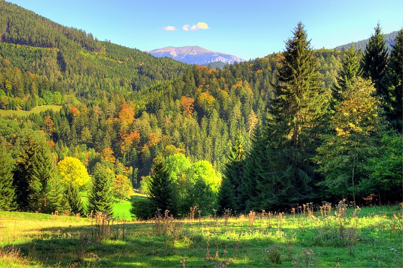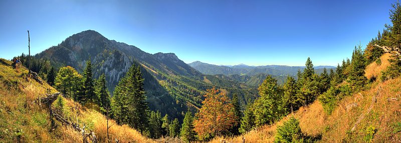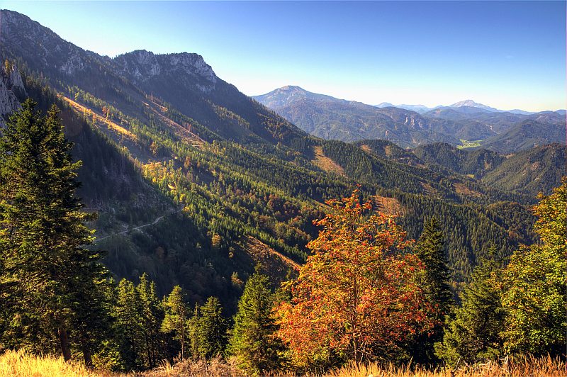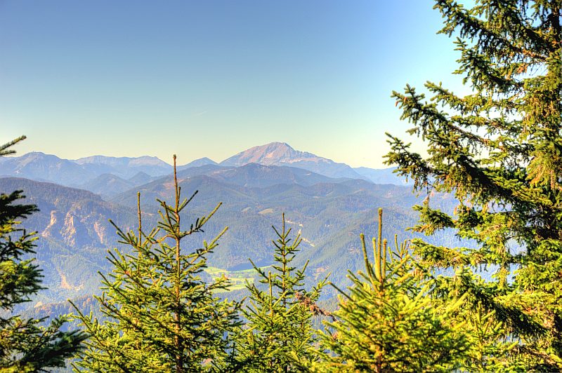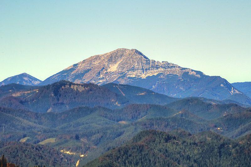 View down the Hoellental, the prominent peak is Mittagsstein, to its left is Krumbachstein. Schneeberg to the left ourtside the picture, as well as Rax to the right.
