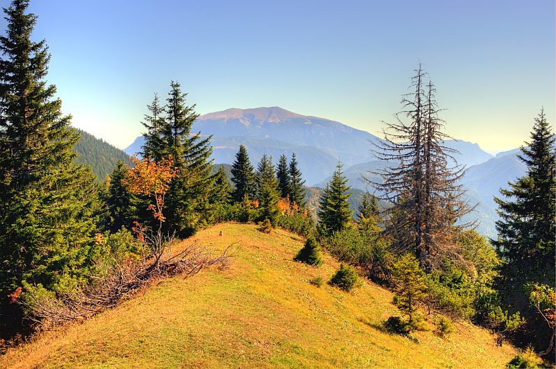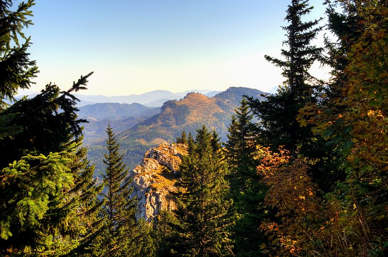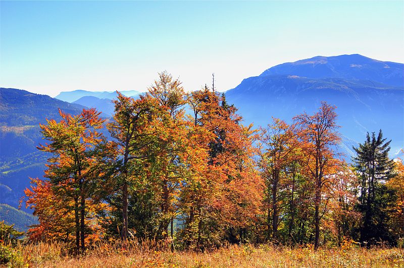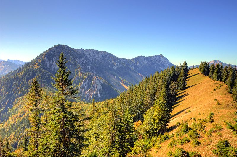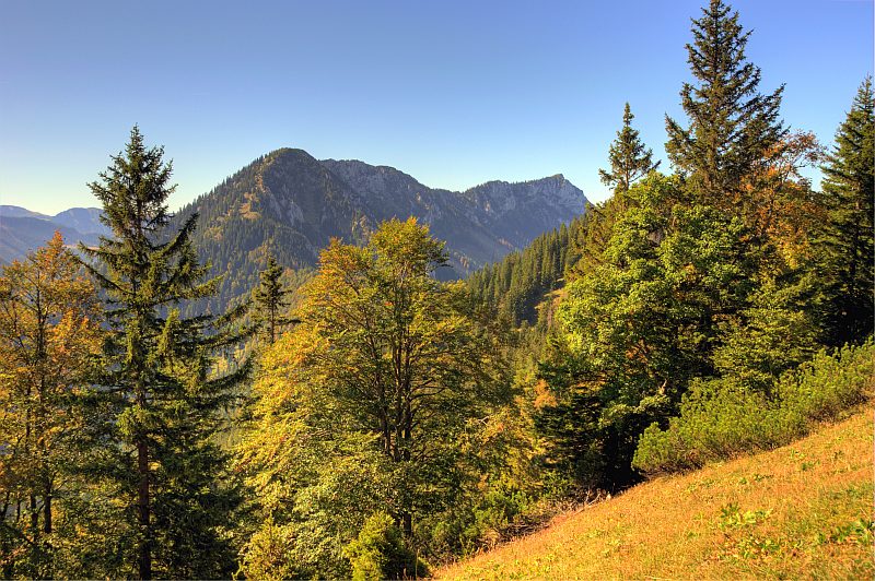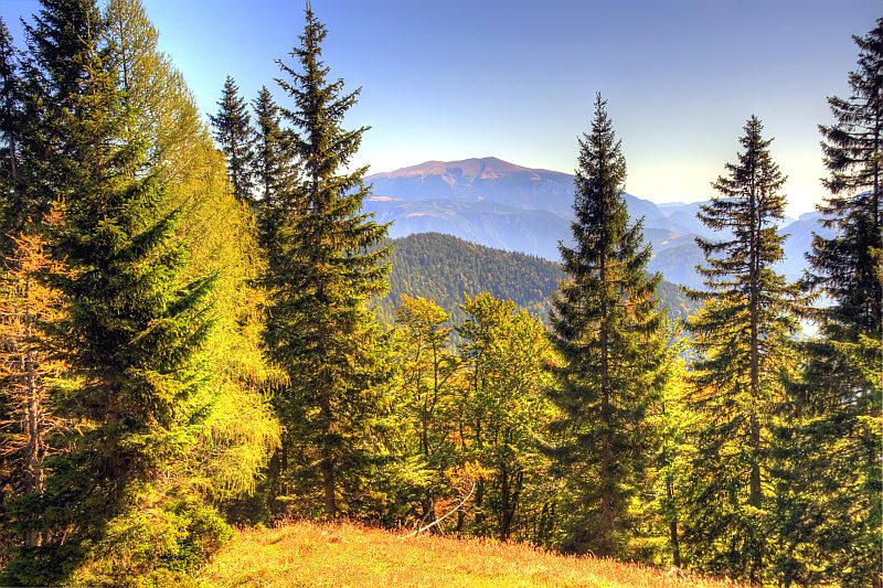View through the trees to Oetscher, far left the Gemeindealm with its skiing area.