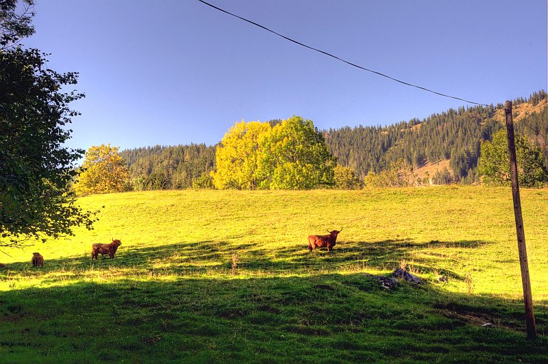 Highland cattle on the autumnal pasture near Schlagerbauer. Close to here, a small water power plant is buzzing on a crital clear beck - it seems to support electric power to the farm.