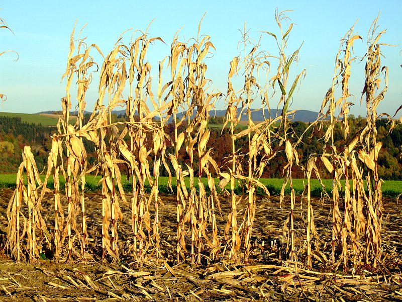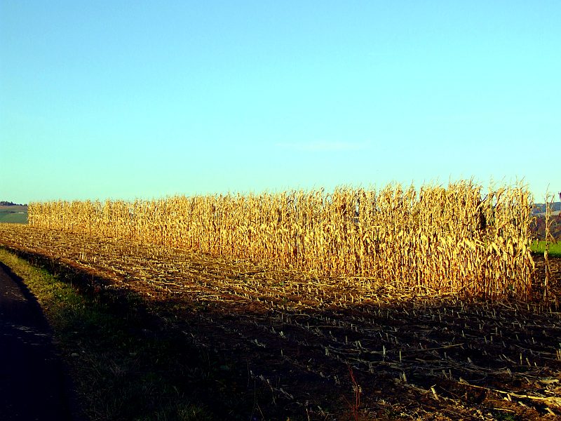 Nur mehr eine Reihe steht. Bei meinen regelmäßigen Fahrten auf dieser Strecke konnte ich beobachten, wie der Streifen immer schmäler wurde. Offenbar wurde regelmäßig die jeweils frische Ernte an Tiere verfüttert.