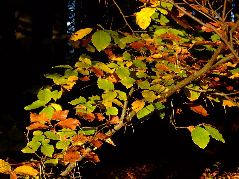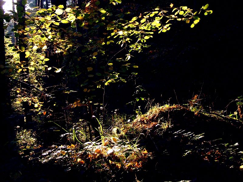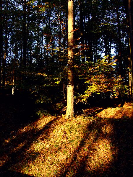 Zuletzt führt die Route durch steilen Wald. Einzelne Durchblicke lassen Sonnenlicht herein.