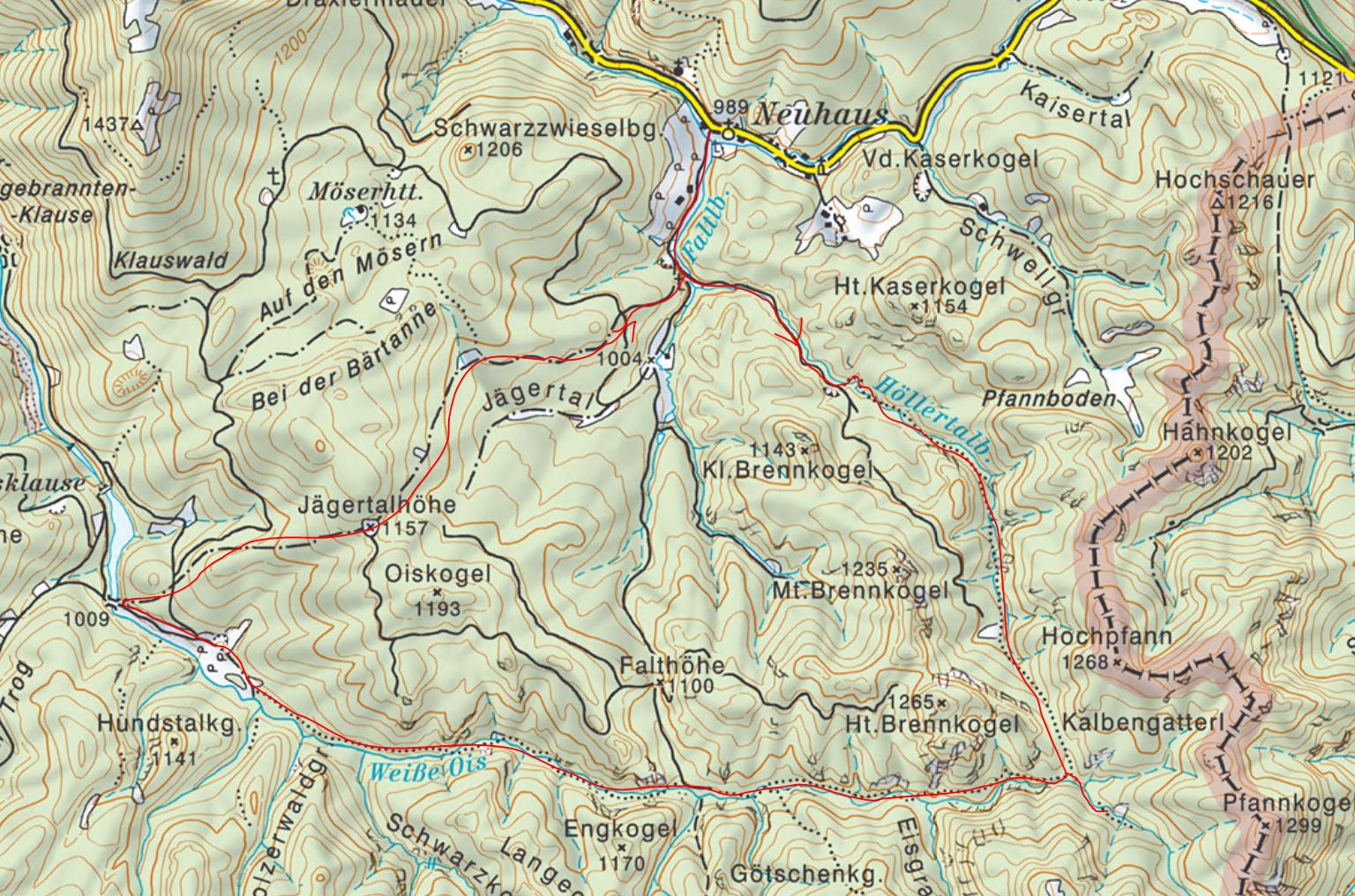 We start from Neuhaus neart the Zellerrain saddle and walk up through the gorge of the Höllertal beck, then over the small saddle iof the Kalbergatterl und the short leg down into the Ois valley, then we turn west walking down the Ois to the reservois and back via the saddle of the Jägertalhöhe.