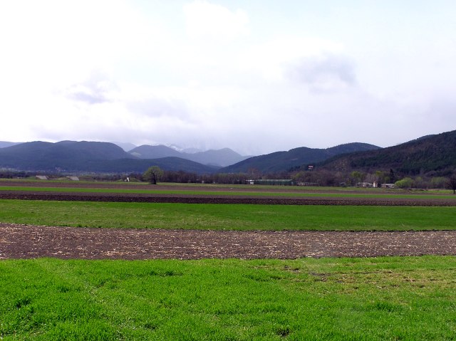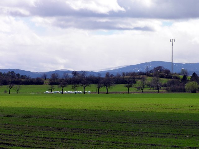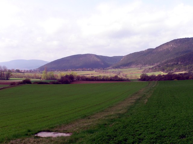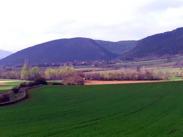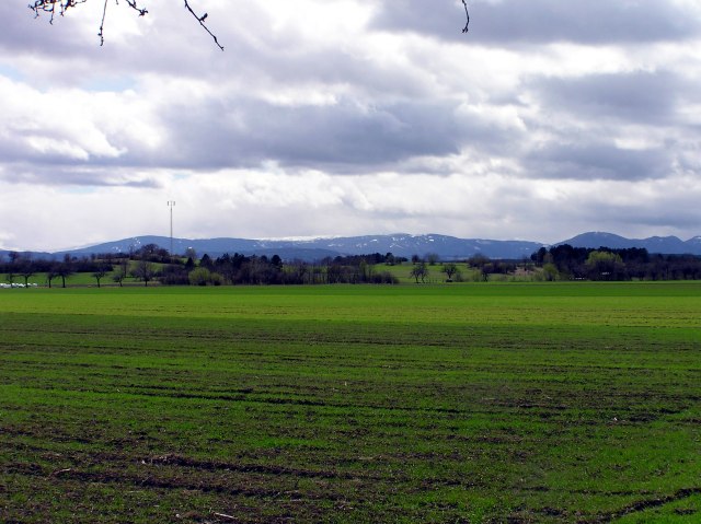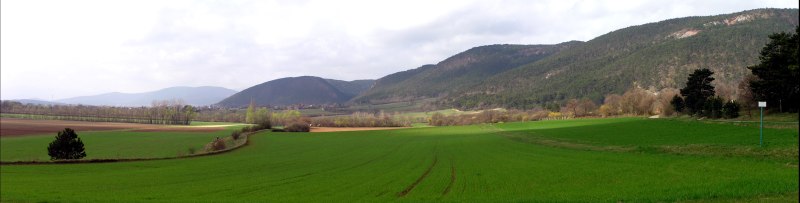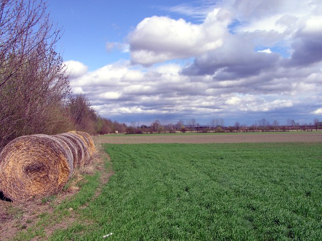 Holy Saturday, 15.4.2006. Today it is much more sunny, though still big clouds drawing over. A short walk from Bad Fischau/Brunn (Jaegerzeile) in direction Winzendorf. View heading for Winzendorf, in the foreground first Viennaīs Mountain water conduct.