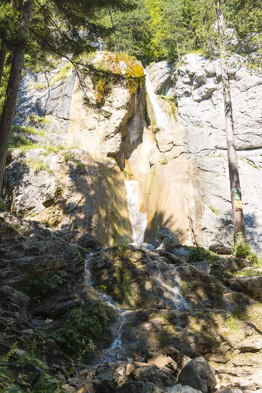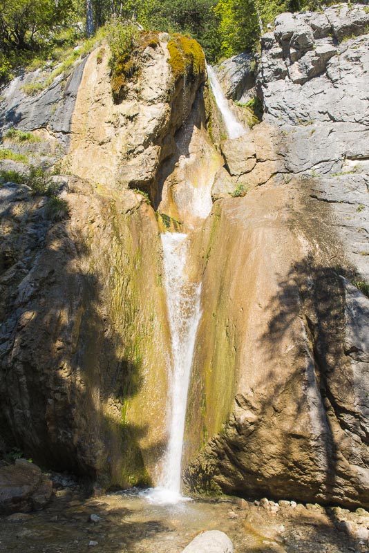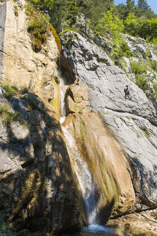 Nicht besonders hoch, aber imposant tost das Wasser hier herunter - noch der langen Trockenheit ist es nicht besonders viel Wasser. Nebenan wird die Wand von Kletterern gerne benutzt.