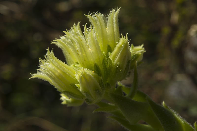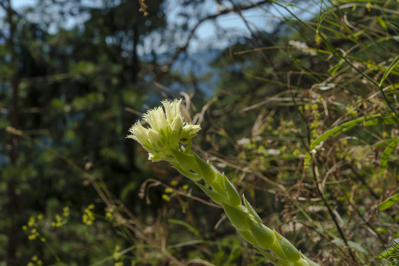 Kurzhaar - Donarsbart (Jovibarba hirta, Sempervivum globiferum subsp. hirtum) wächst auf den Felsen oberhalb des Wasserfalls