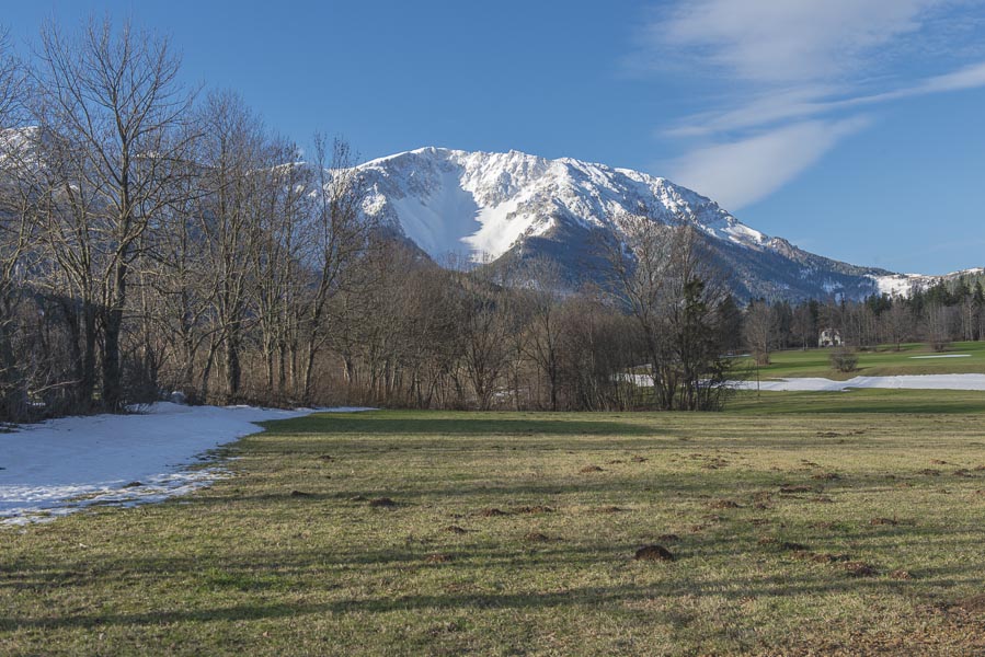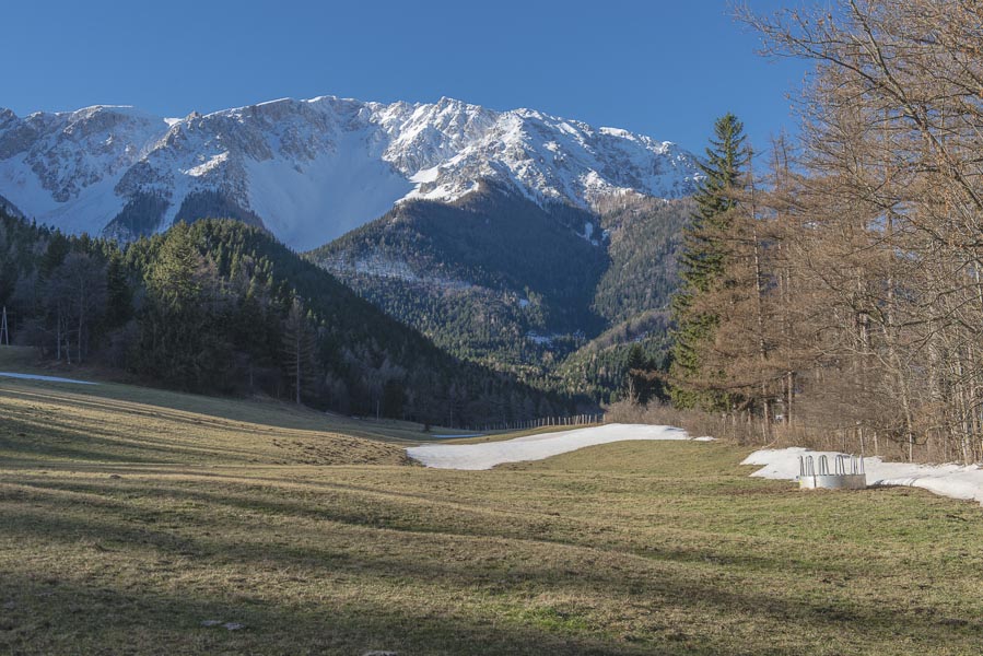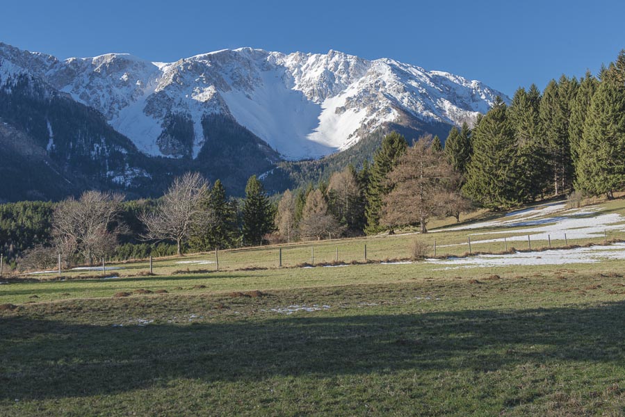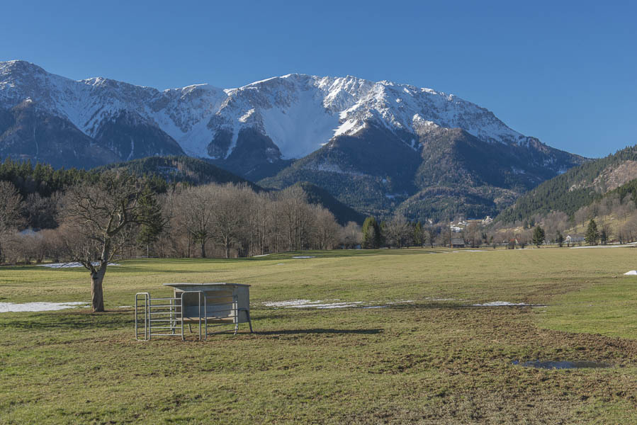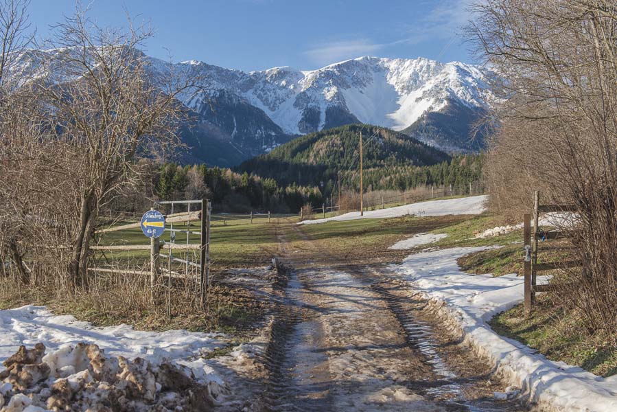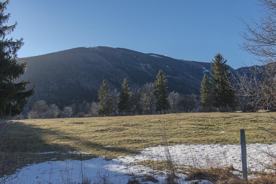 At the upper end of the small forest area. Slowly, the areas around Schneebergdörfl escape the shadow of Hoher Hengst.