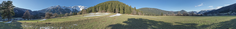 330 degree panoramic picture with Hengst, Schneebergdörfl, Schneeberg, Hühnerbühel/Grössenberg, Öhler, Haltberg, Hohe Wand (Geländ), Himberg and once more Hengst. Click here or into the picture for a larger display.