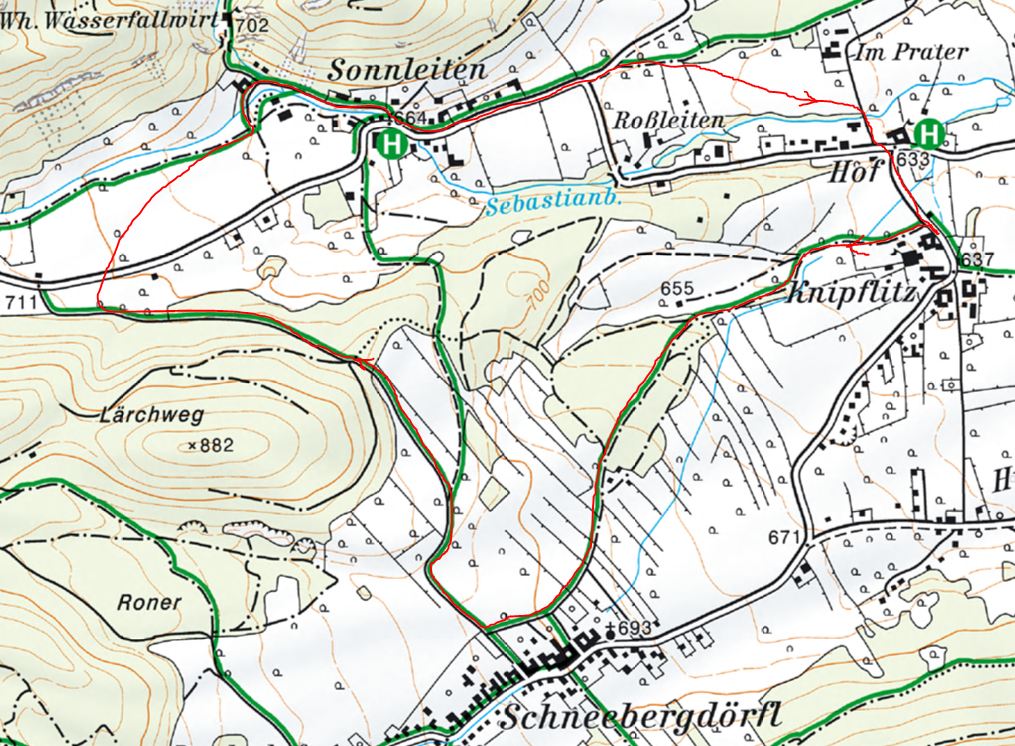 Wieder einmal eine Kinder - Reitstunde in Puchberg und bei schönem aber etwas windigem Wetter eine Wanderung rund um den Weiler Knipflitz. Vom Halmerhof starte ich Richtung Schneebergdörfl, biege dann nach rechts ab Richtung Losenheim und kehre über Sonnleiten und Hof wieder zurück.