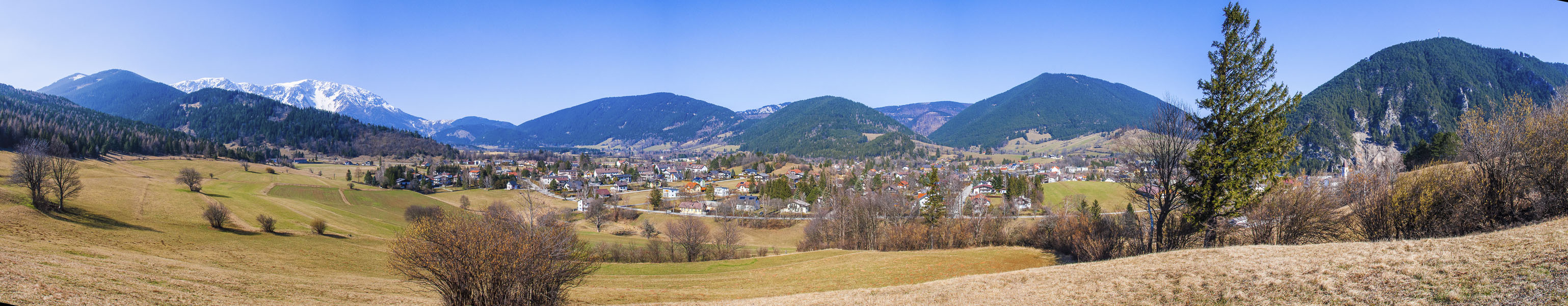 270 Grad Panorama des Puchberger Tals, von der Falkhöhe aus gesehen - vom Hohen Hengst (ganz links) über Schneeberg und Dürre Wand bis zum Himberg.