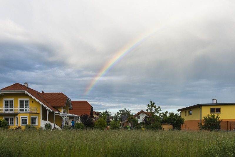 30.5.2014: Nach dem Heimkommen am Abend ein Anruf von Hansjürgen Pietsch: "Schau mal raus, was für ein schöner Regenbogen". Hansjürgen und Karin Pietsch sind bei einer Kinderparty und haben dies von der Terrasse aus gesehen.