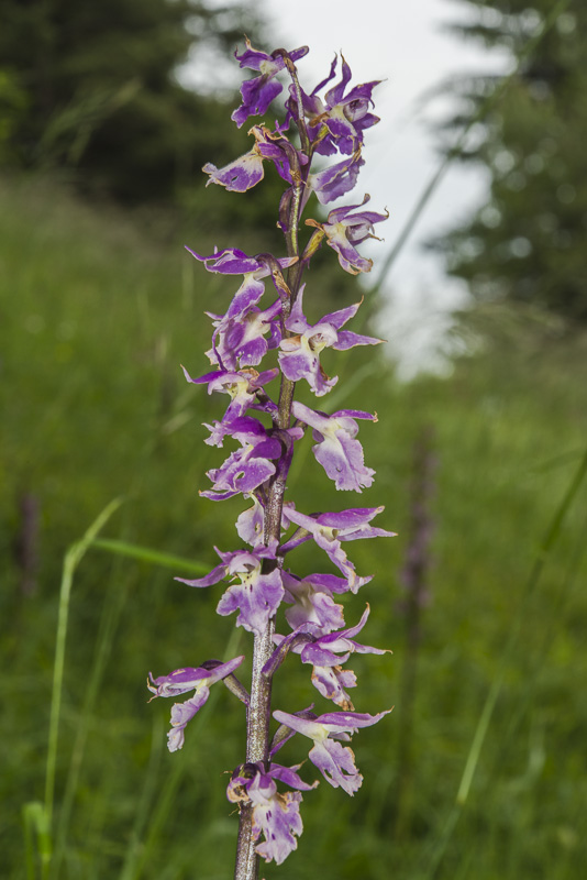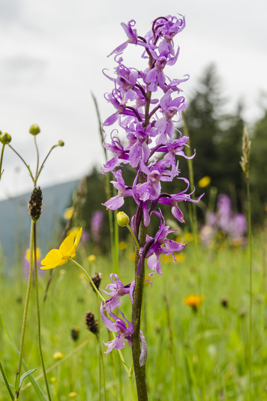 Im Obstgarten hinter dem Schwabenhof, am Waldesrand, wächst das Stattliche Knabenkraut (Orchis mascula subspecies signifera)