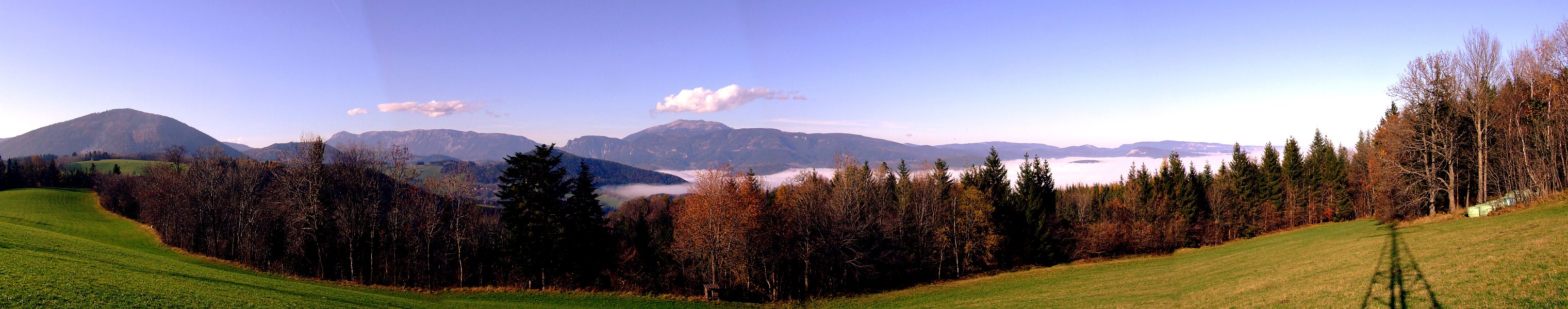 Panorama seen from above (east of) Rams saddle with Great Otter, Rax and Schneeberg. Far right the steep escarpments of Goesing with Hohe Wand behind.
