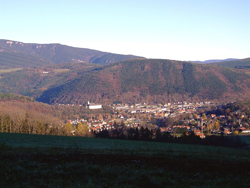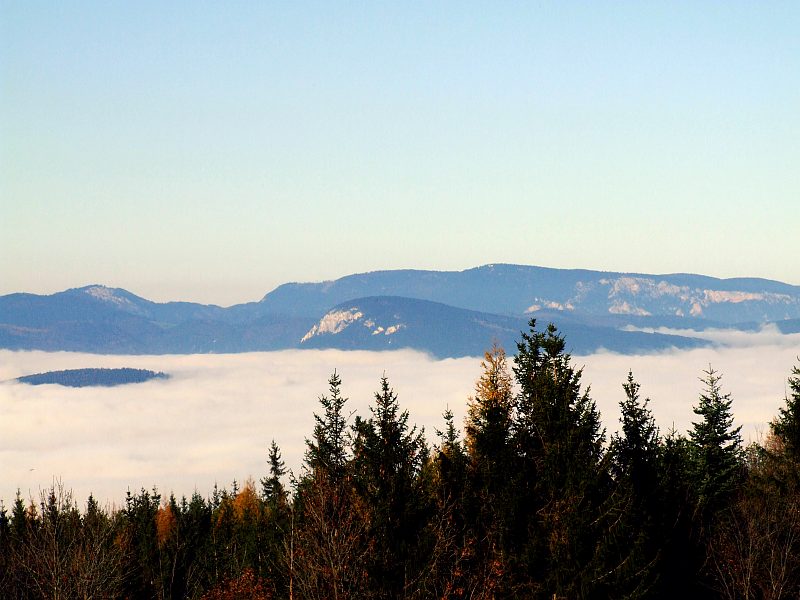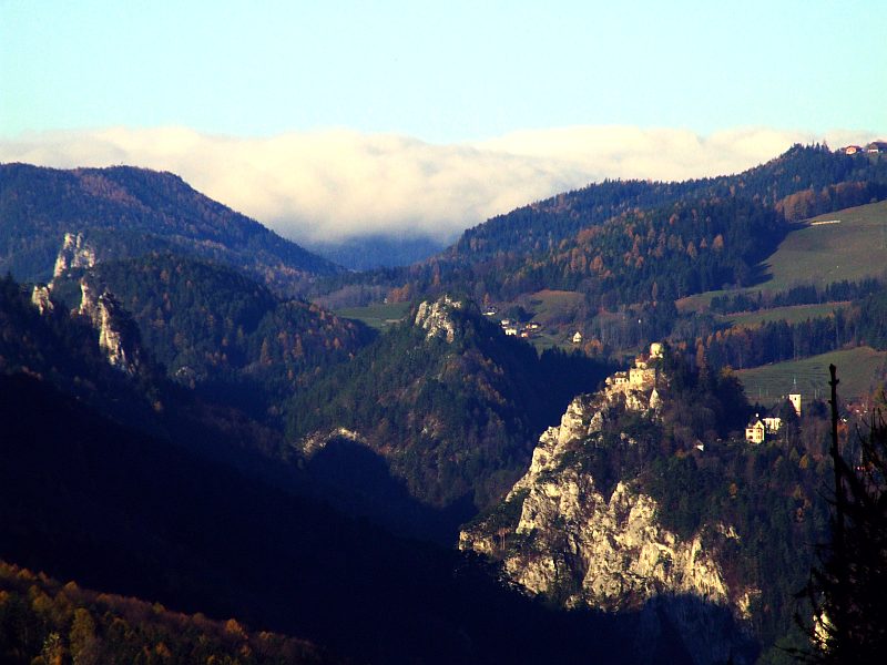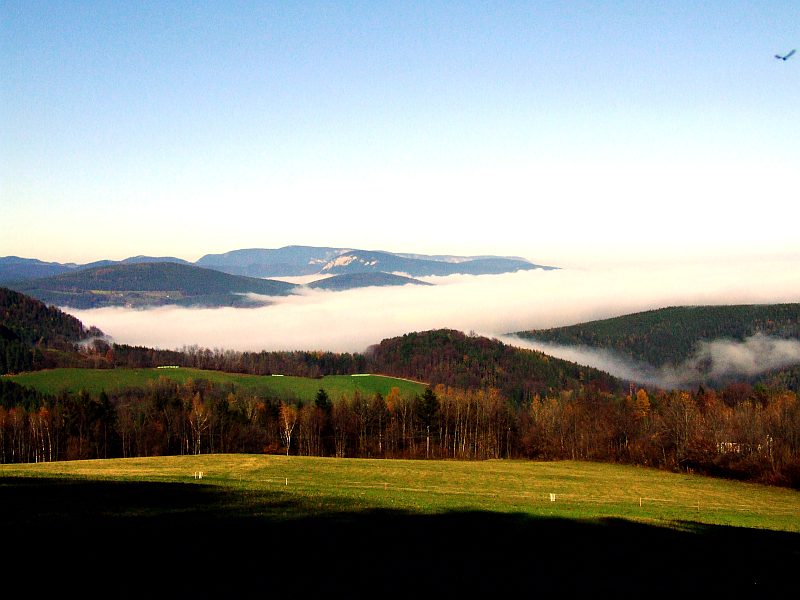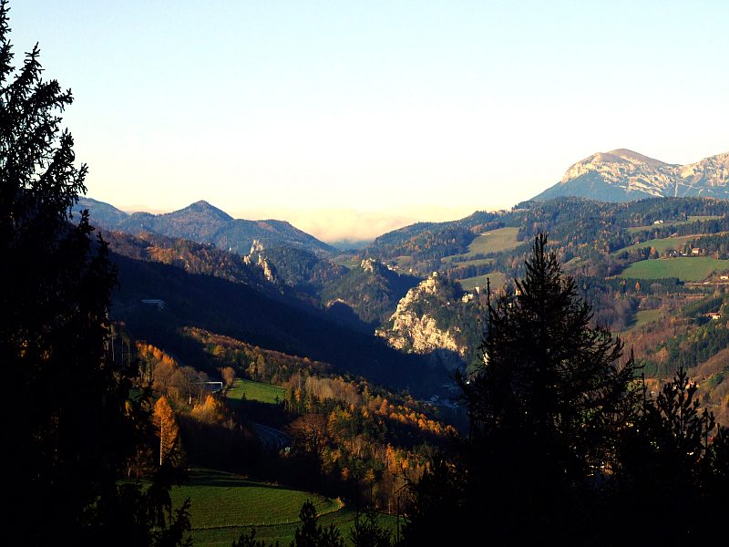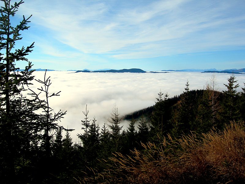 Blick zu den Adlitzgräben. Im Hintergrund lauert die Nebeldecke, die über dem oberen Mürztal liegt und offenbar nur bis zum Semmeringpass reicht, ein relativ häufiges Ereignis. Das Mürztal liegt wesentlich höher als diese Gegend, was die Luft scheinbar doch kälter und damit nebelanfälliger macht.