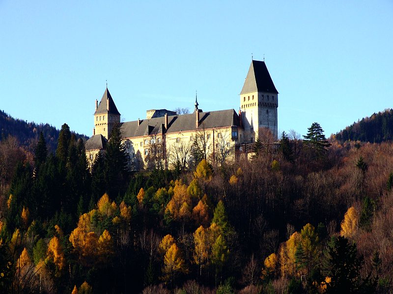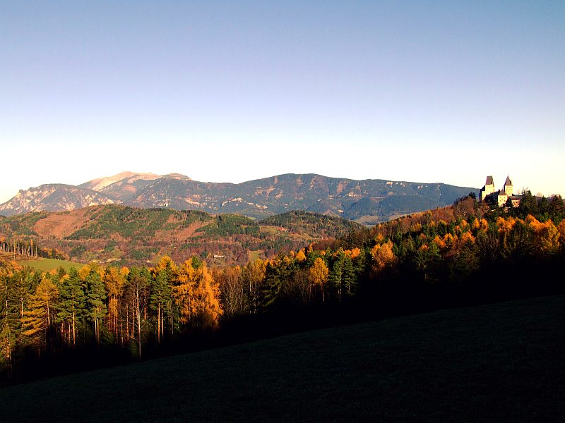 Oberhalb der Burg, kurz vor der kleinen Ortschaft Schlagl, unweit von Raach: Blick zur Burg Wartenstein und zum Schneeberg.