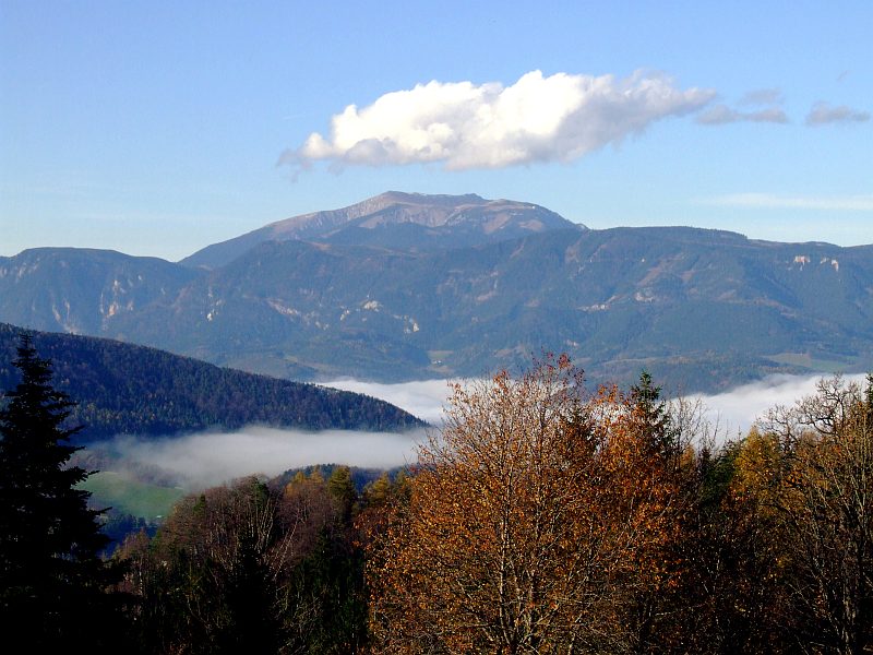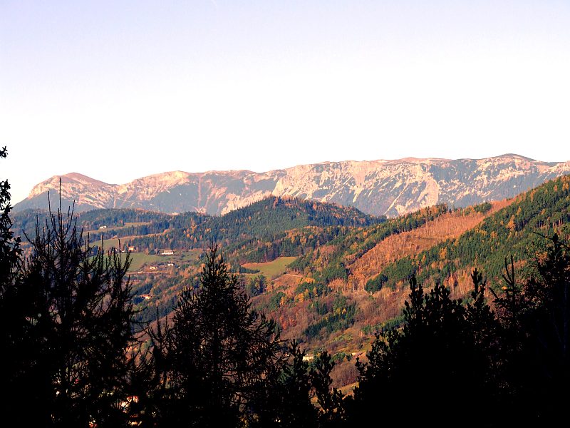 Am Horizont die Hohe Wand, mit dem "Geländ" ganz links. Davor der Gösing mit der steil nach links ins Sierningtal abfallenden Felswand.