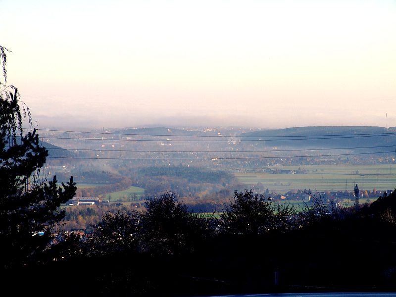 In Raach angekommen. Blick vom Parkplatz beim Seminarzentrum. Über der Ebene liegt weiterhin der Nebel.