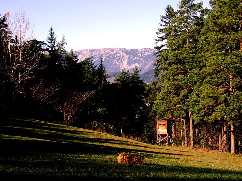 Ich gehe ein kleines Stück bis zu einer Waldwiese. Im Hintergrund die Rax.