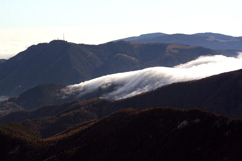 So sah die Wolkenmauer zur selben Zeit von oben (von der Rax gesehen) aus. Im Vordergrund das Preinergscheid, dahinter der Semmering mit dem Sonnwendstein dahinter. Beide Male strömt der Nebel über den Sattel - und löst sich dahinter auf. Die Balance zwischen Luftfeuchtigkeit und Temperatur mit der Entscheidung, ob sich Nebel bildet oder auflöst, ist offenbar eine ganz delikate ... Foto: Herwig Gießwein