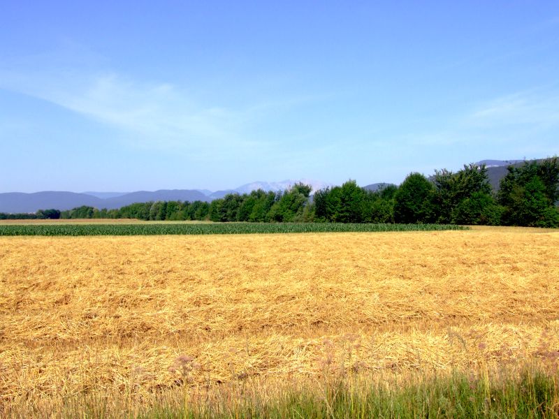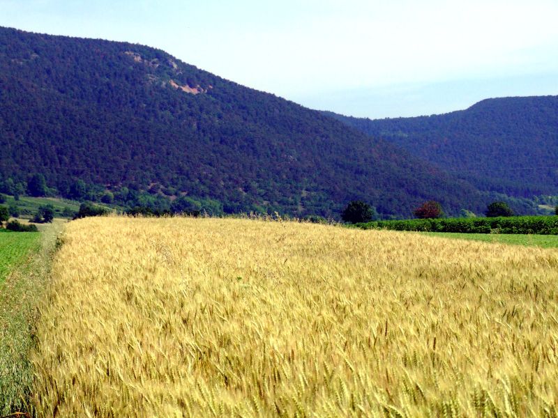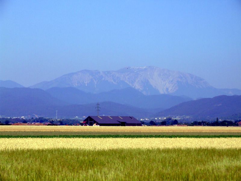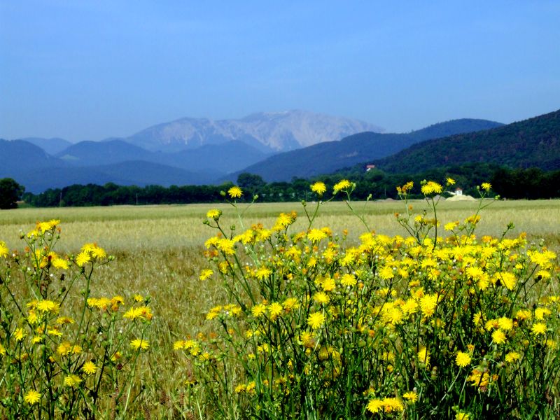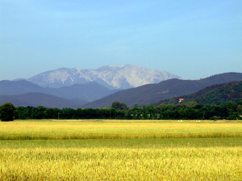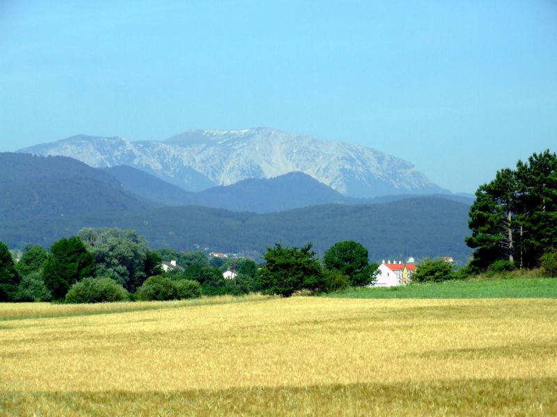 Wir brechen morgens schon um 8 Uhr (damit es nicht zu heiß ist) auf. Zwischen Winzendorf und Weikersdorf sind die Felder jetzt besonders schön. Blick zum Schneeberg (2.075 m)