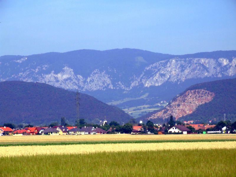 ... und zur Hohen Wand, mit Weikersdorf im Vordergrund, dessen Häuser den Blick auf Winzendorf verstellen, von dem man nur die wenigen höhergelegenen Häuser unterhalb des Steinbruchs sehen kann.