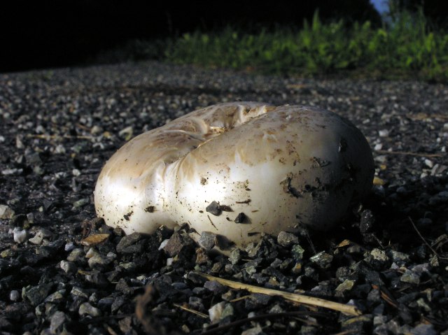 One Kilometer further: a field mushroom breaks through asphalt on a forest path entrance