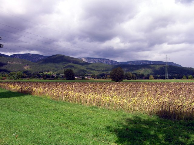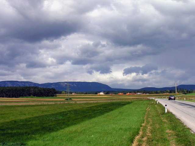 View in direction north to Hohe Wand, in front of it the first houses of Mollram.