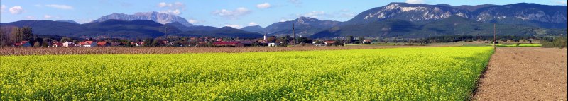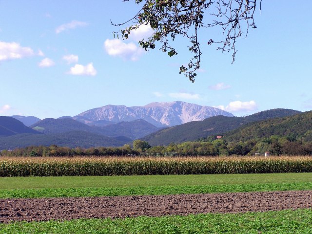 Panorama von Schneeberg und Hoher Wand, von nahe Saubersdorf aus gesehen. Ins Bild klicken für eine größere Darstellung.