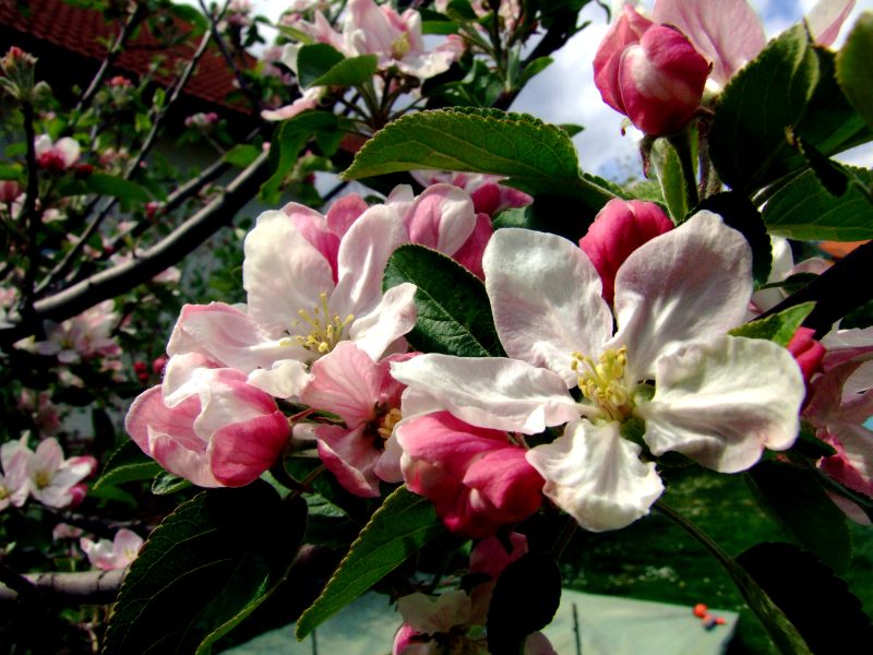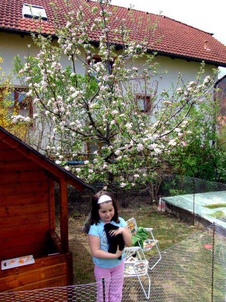Zu Hause blüht der Apfelbaum inmitten des neuen Kaninchengeheges.