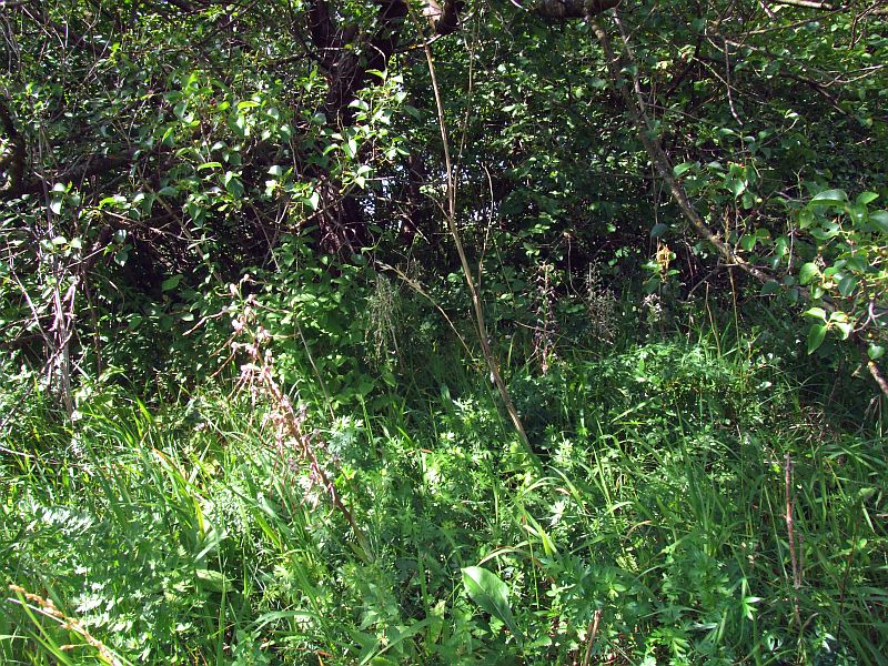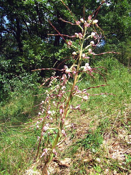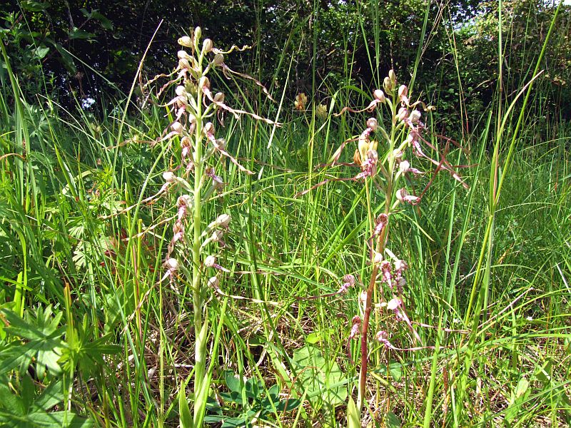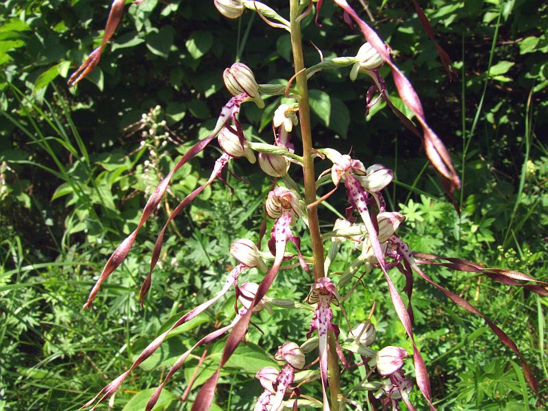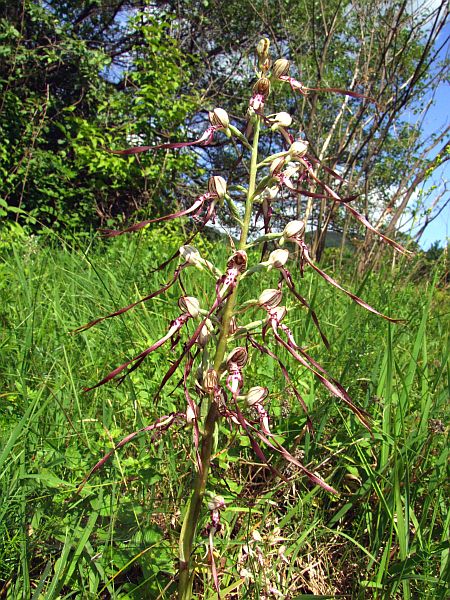 Nahe an Gebüschen blüht jetzt eine bizarre, bei genauer Betrachtung aber überaus attraktive Orchidee: die adriatische Riemenzunge (Himantoglossum adriaticum)