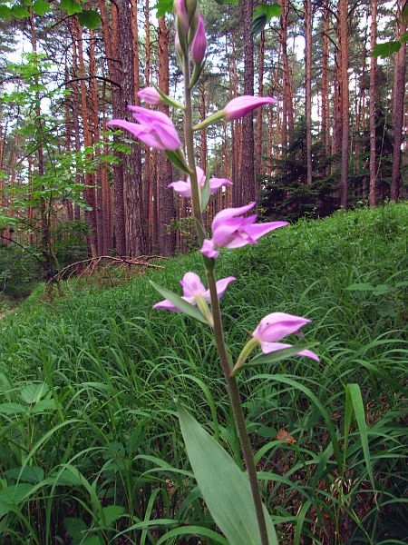 Weiter durch den Wald: hier im tiefen Schatten (deswegen das Bild nicht ganz scharf): eine weitere Orchidee, das Rote Waldvöglein (Cephalanthera rubra)