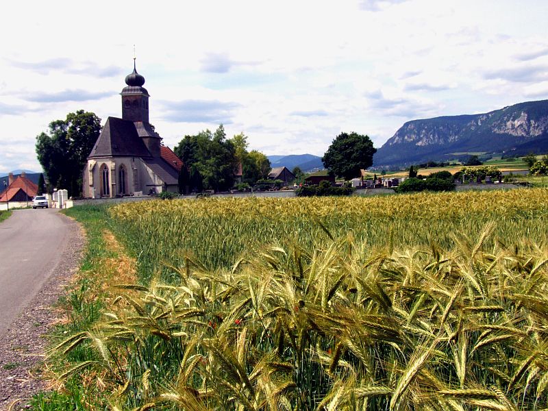 ... zur Muthmannsdorfer Kirche, die ein wenig außerhalb steht. Rechts hinten die Hohe Wand.