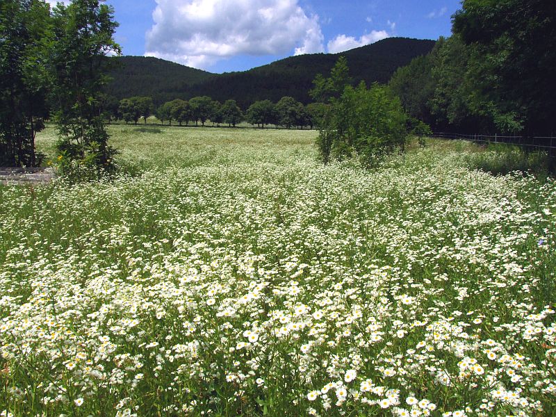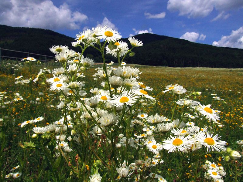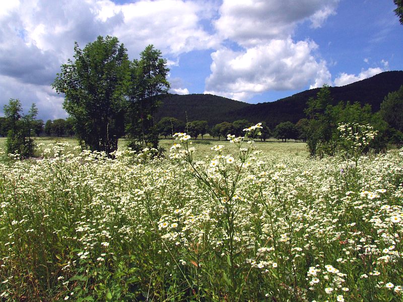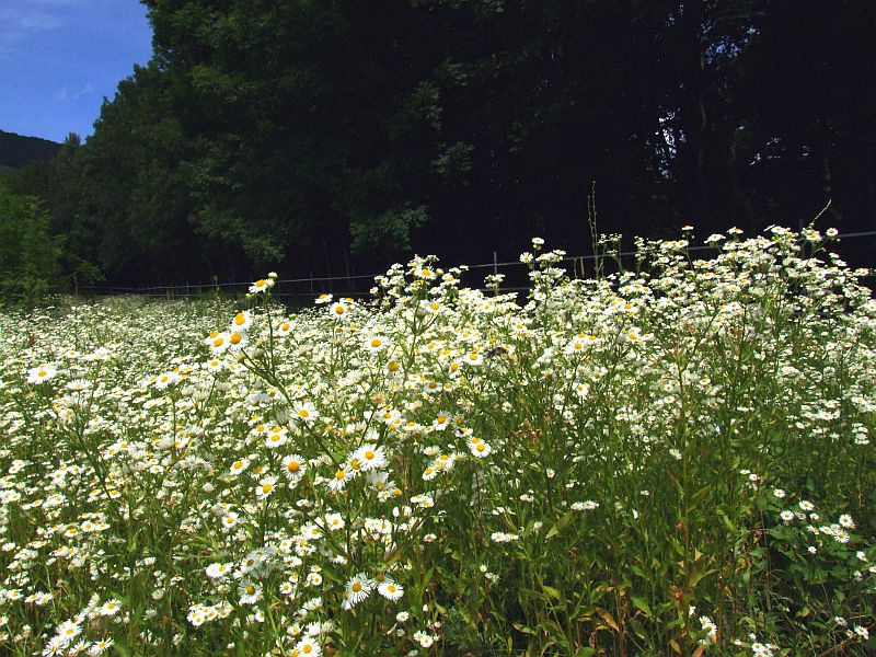 Pferdeweide hinter Strelzhof, im Hintergrund ganz rechts der Grössenberg. In Massen wächst hier das Einjährige Berufskraut (Erigeron annuus)