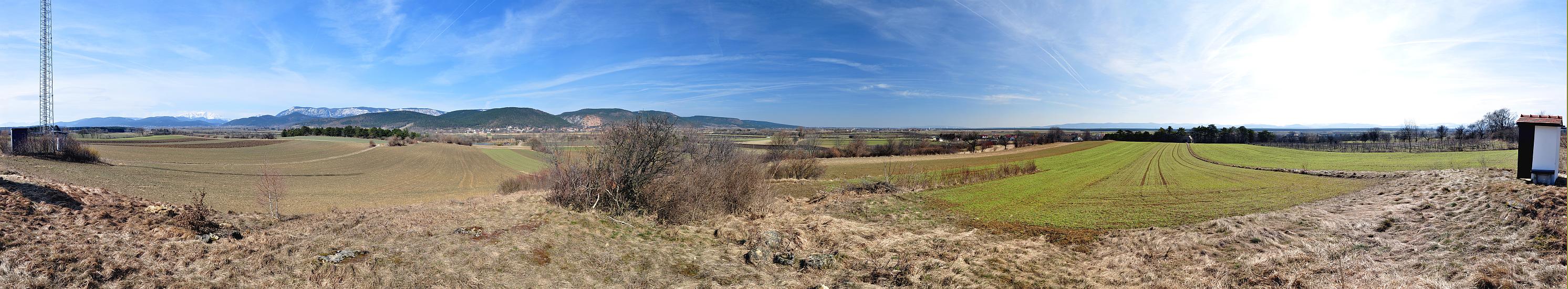 360 Grad Panorama von einem Hügel westlich von Saubersdorf. Von links nach rechts Schneeberg, Hohe Wand, Fischauer Berge mit Winzendorf und dem Steinbruch, Rosaliengebirge, Bucklige Welt/Wechselregion.