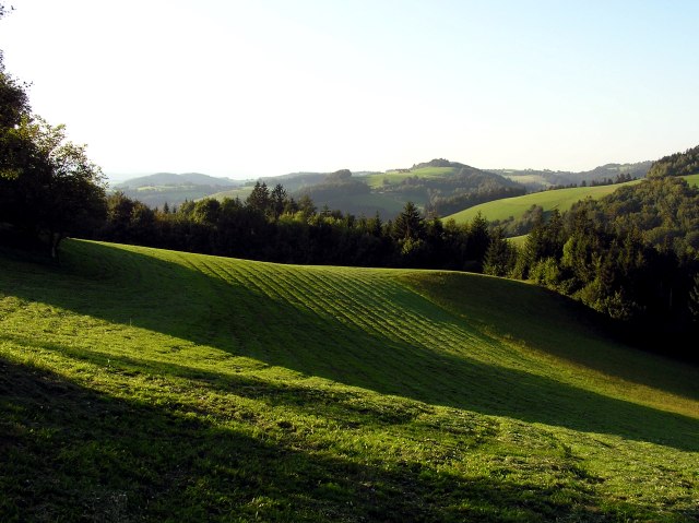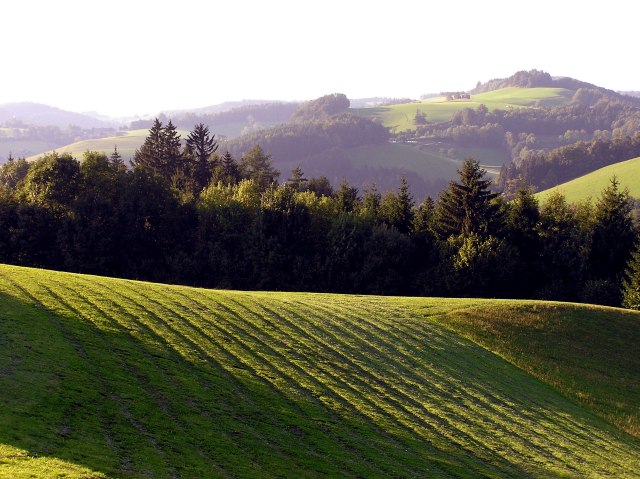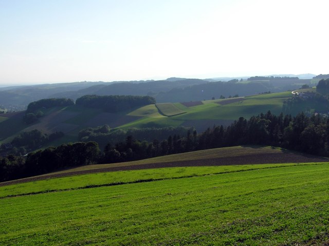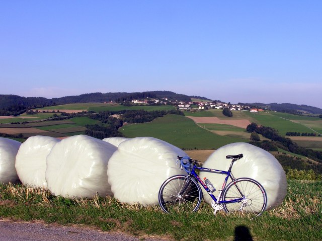 ... whereas this hay is wrapped already. View from a bit after Hattmannsdorf over the dale to Hochneukirchen.