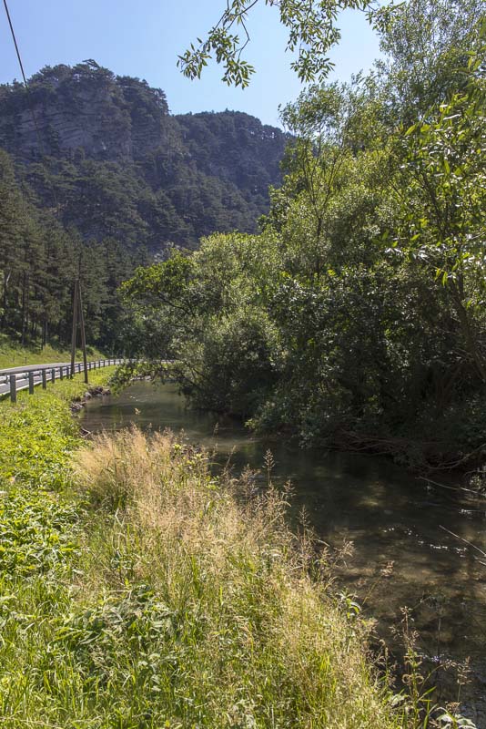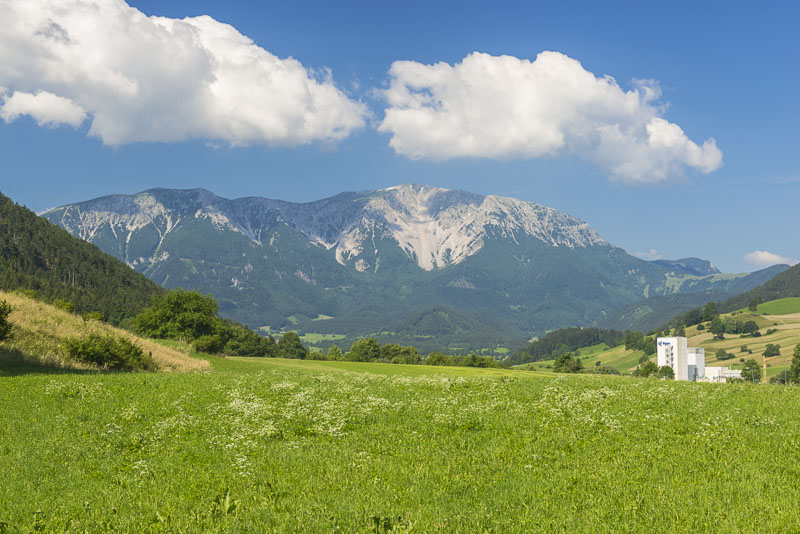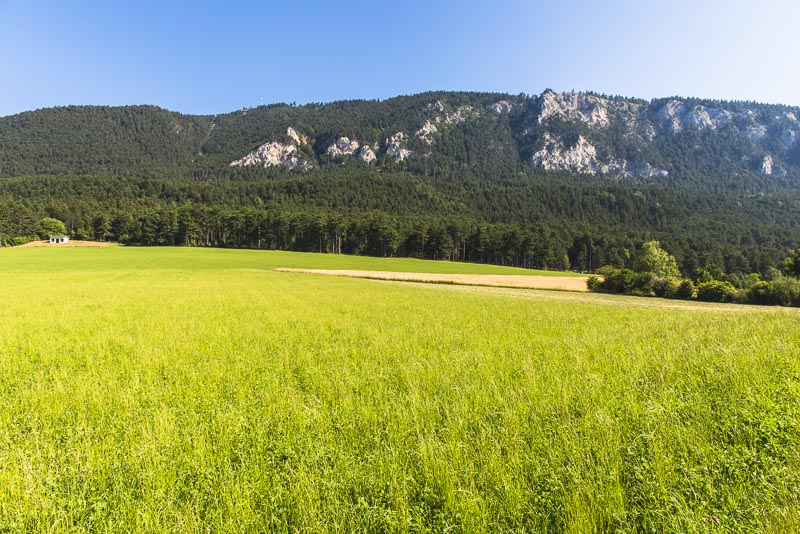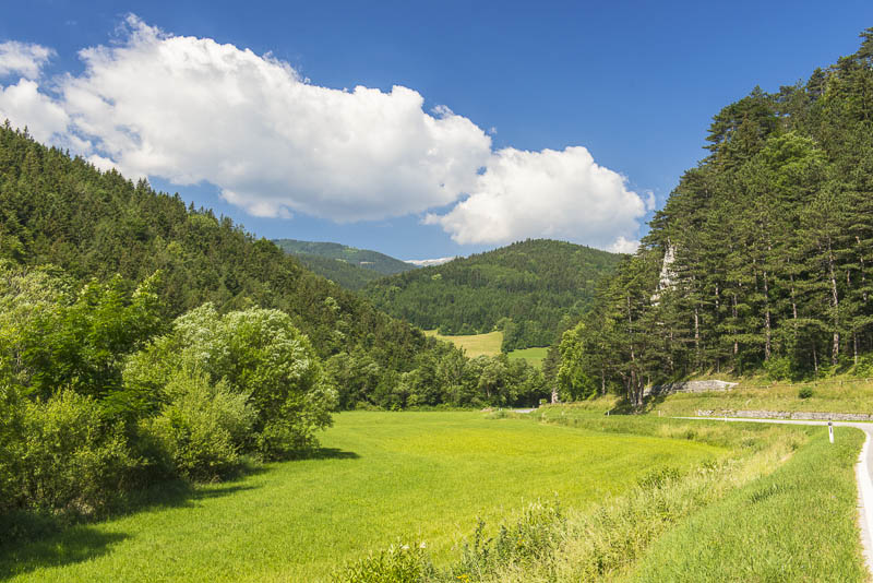 Im Sierningtal. Von hier sieht man gerade noch den Gipfelgrat des Schneebergs.