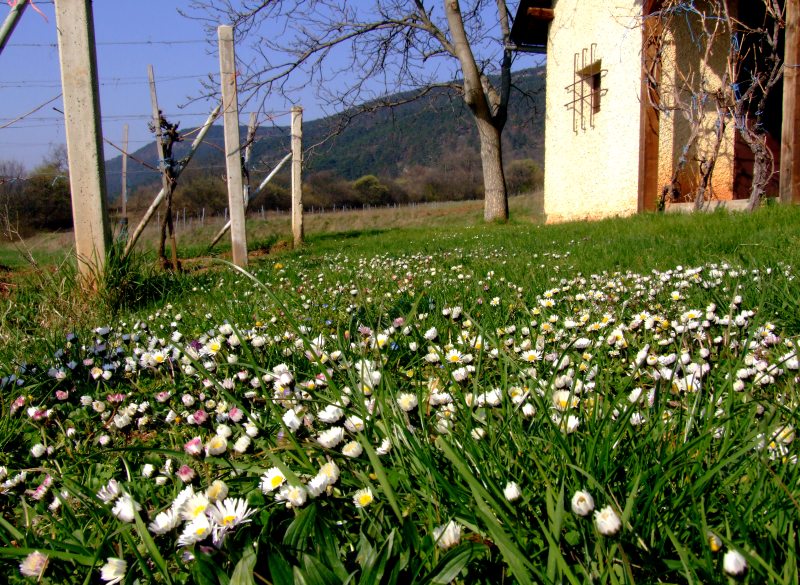 Eine Wiese bei einer Hütte am Weingarten ist übersät mit Gänseblümchen.