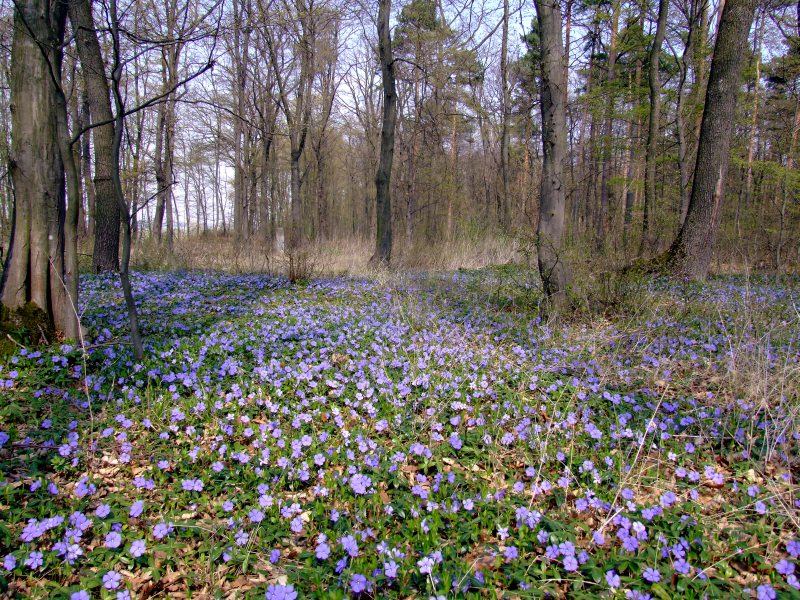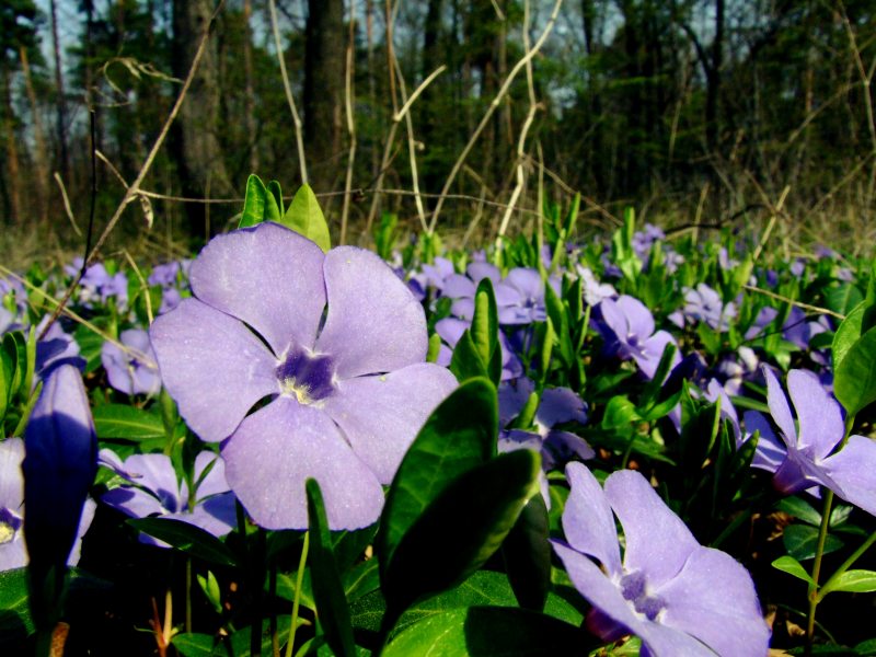 Im Wald bei Neudörfl auf einmal neben der Straße ein hellblauer Fleck: Unmengen von Immergrün (Vinca minor)