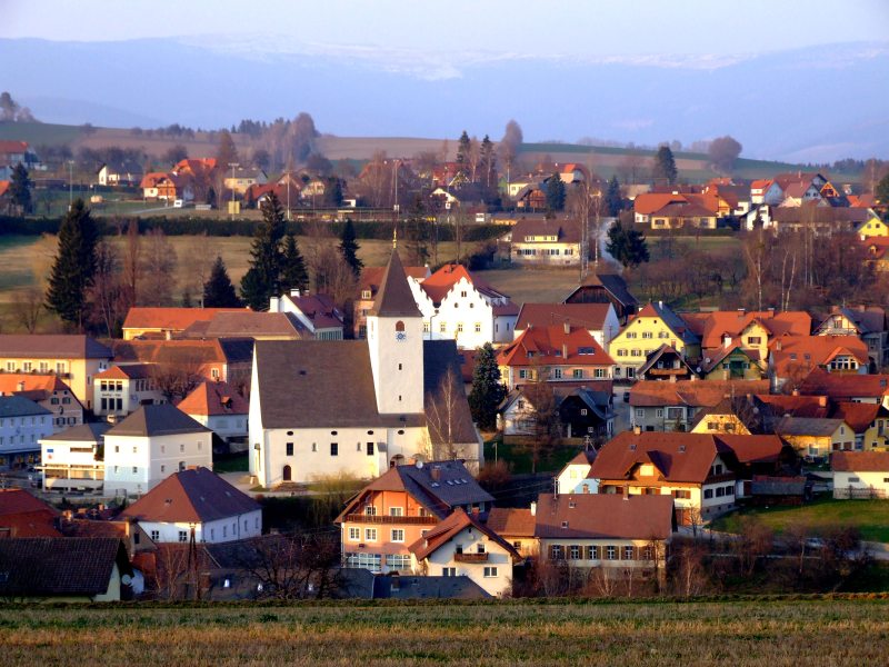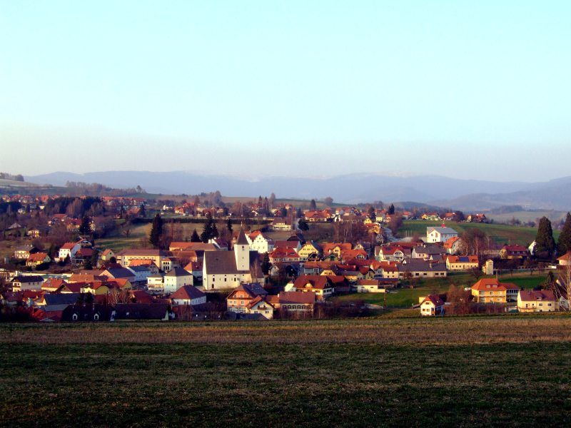Blick vom Stift über die Ortschaft, die sich in eine kleine Senke der Hochfläche duckt.