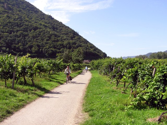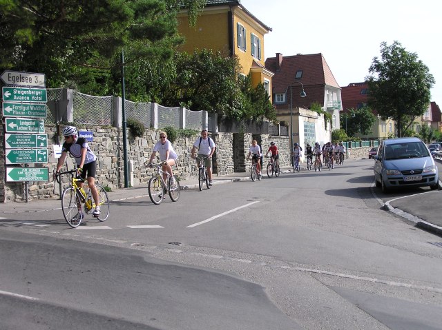 With my wife I join a group of bicyclists who ride through Wachau today, on different routes with the bicycle and boat. We start in Krems at the Kolping house at the University Krems, and ride along the southern (orographic right) shore of the river Danube, up to Melk, about 40 km, and return with the boat to Krems.