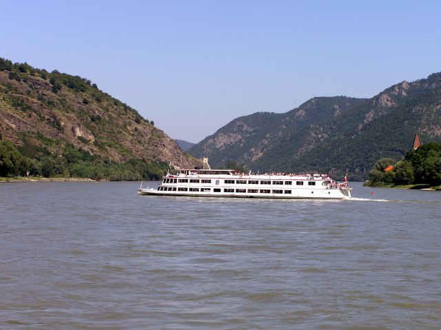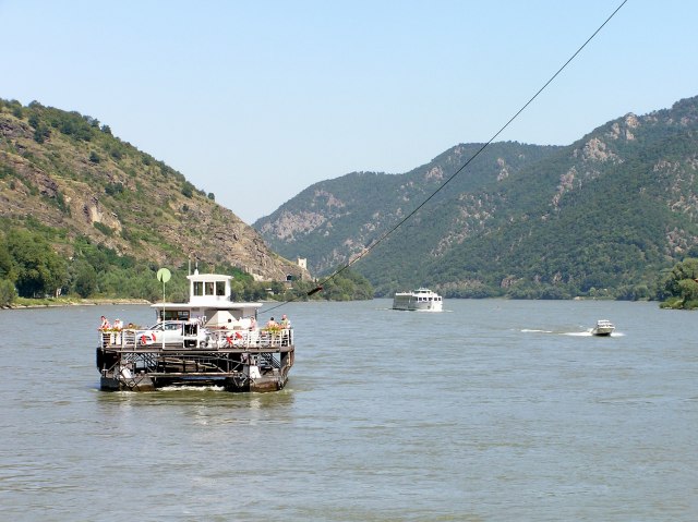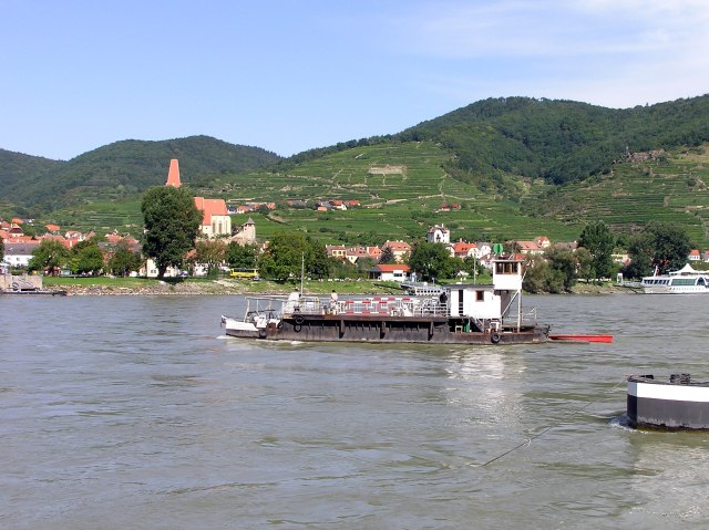 The rolling ferry near Spitz. This boat does not have any motor, but is hanging with reels on a steel rope spanned above the river. By tricky steering in the stream, the boat goes from one shore to the other.